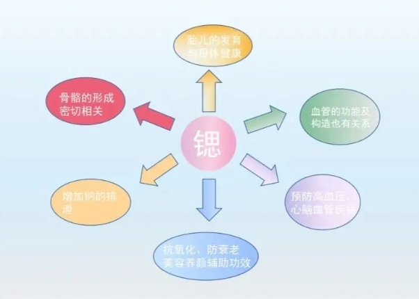 锶与心血管疾病的关系研究表明,饮用水中的锶含量越低,心血管疾病的死亡率就越高。而含有5.0~10.0mg/L锶的饮用水可以程度地降低心血管疾病的死亡率。此外,饮用水和尿液中的锶含量与高血压性心脏疾病呈显著的负相关,饮用水中钠/锶比值与多种心血管疾病(如中枢神经系统血管损伤、动脉硬化、退行性心脏病、高血压性心脏病)呈显著正相关。这是因为锶可能会在肠道内与钠进行竞争性吸收,从而减少钠的吸收并增加对钠的排泄,这样就可以降低由过高的钠含量引起的高血压和其他心血管疾病。