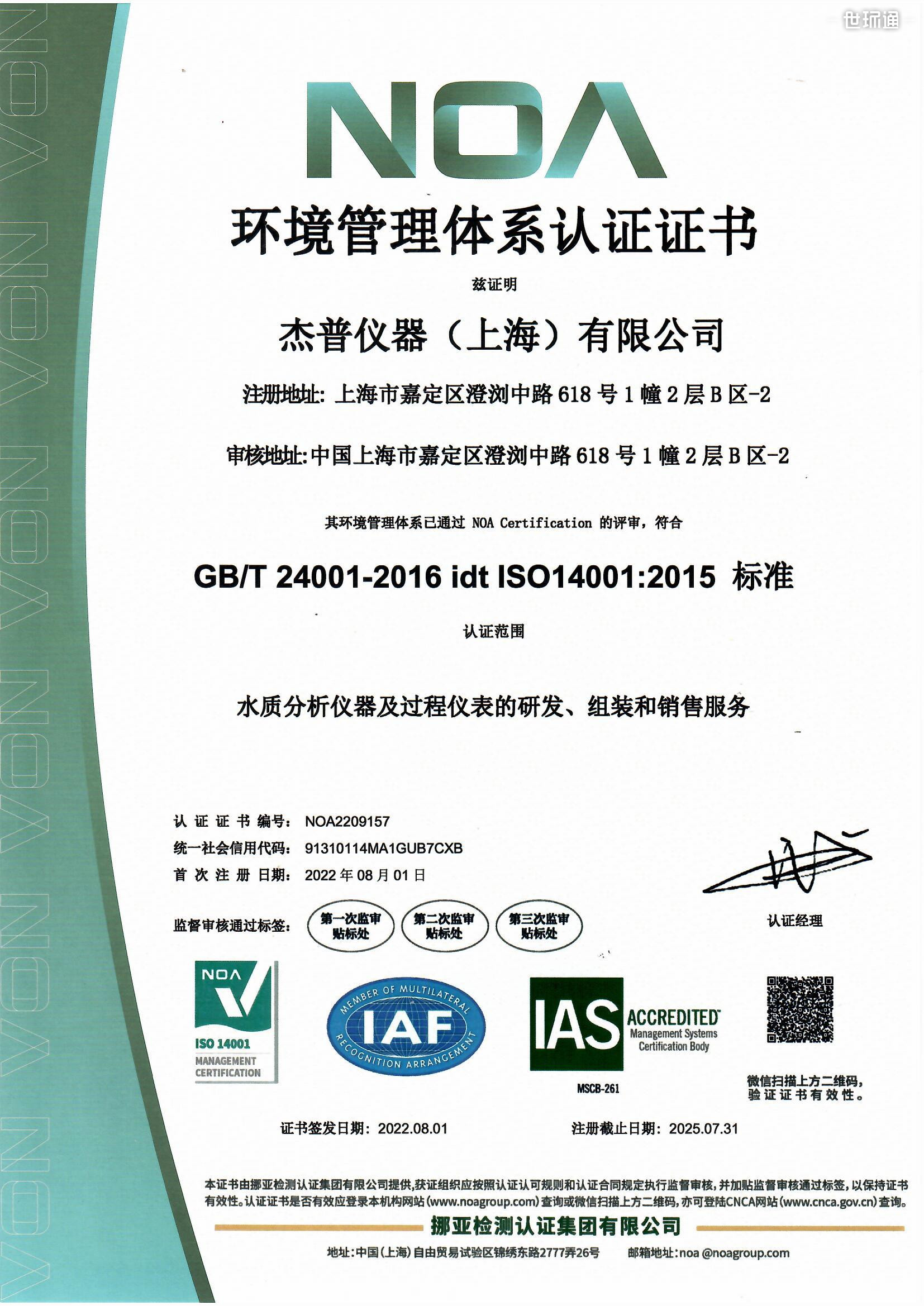 ISO环境管理体系认证证书