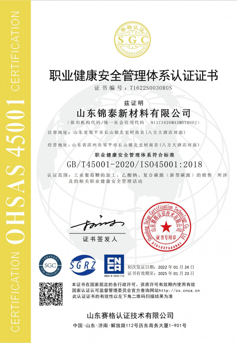 职业健康安全管理体系认证证书