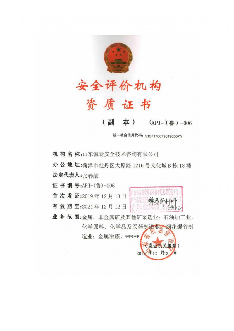 安全评价机构资质证书