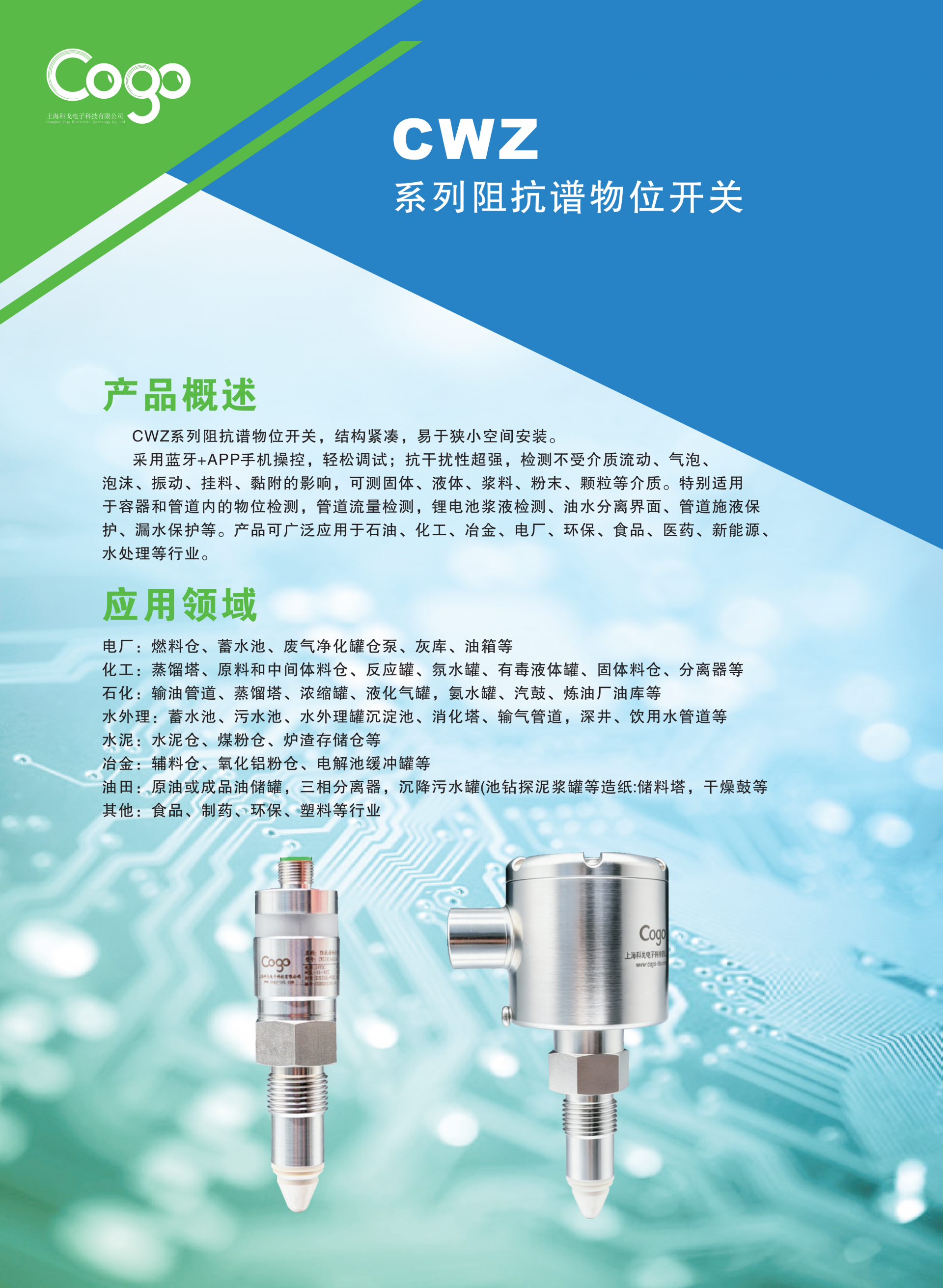 CWZ 系列阻抗谱物位开关是上海科戈电子推出的新一代智能物位检测仪表,采用先进的阻抗谱谐振检测技术,结构紧凑小巧,适配狭小空间安装场景。产品搭载蓝牙 + APP 手机操控系统,调试便捷高效;具备超强抗干扰能力,检测不受介质流动、气泡、泡沫、振动、挂料、黏附等因素影响,可精准测量固体、液体、浆料、粉末、颗粒等多种介质。