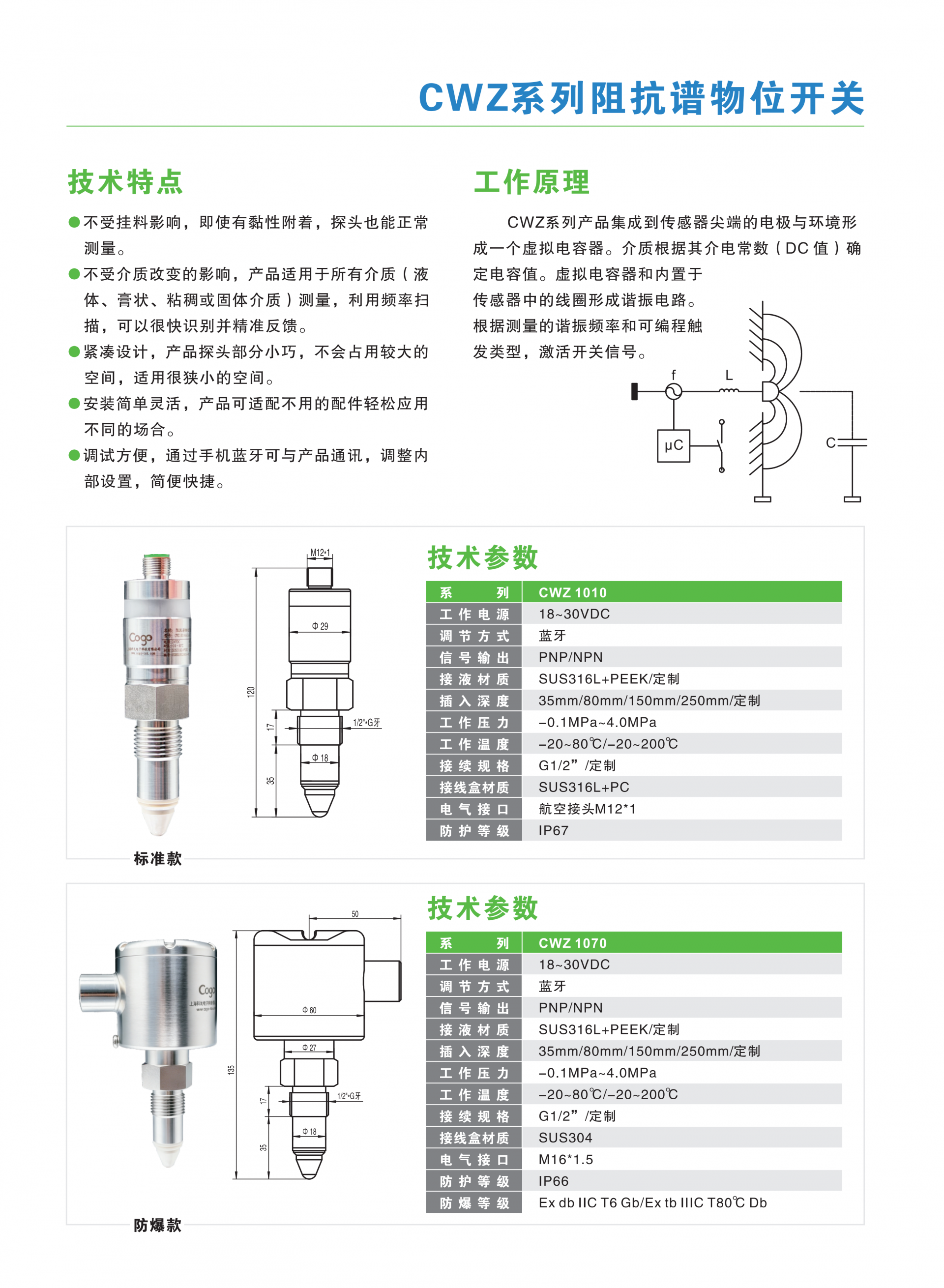 项目 CWZ 1010(标准款) CWZ 1070(防爆款) 工作电源 18-30VDC 18-30VDC 调节方式 蓝牙 APP 调试 蓝牙 APP 调试 信号输出 PNP/NPN PNP/NPN 接液材质 SUS316L+PEEK / 定制 SUS316L+PEEK / 定制 插入深度 35/80/150/250mm / 定制 35/80/150/250mm / 定制 工作压力 -0.1MPa~4.0MPa -0.1MPa~4.0MPa 工作温度 -20~80℃ / -20~200℃ -20~80℃ / -20~200℃ 接线规格 G1/2"/ 定制 G1/2"/ 定制 接线盒材质 PC 材质 SUS304 不锈钢 电气接口 航空接头 M12*1 M16*1.5 防护等级 IP67 IP66 防爆等级 - Ex db IIC T6 Gb/Ex tb IIIC T80℃ Db
