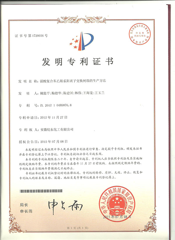 首页 > 荣誉资质 > 强酸复合苯乙烯系阳离子交换树脂的生产方法