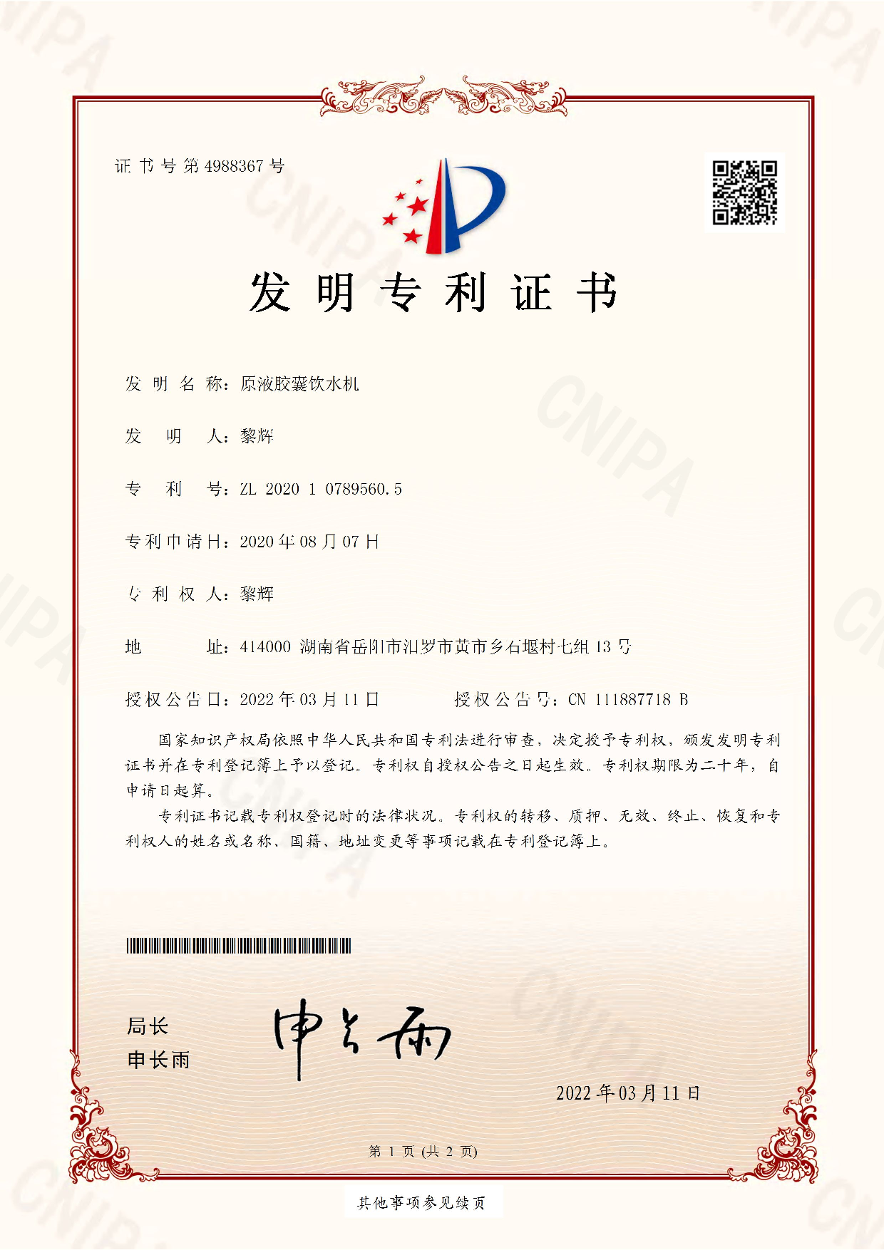 发证机构: 国家专利局 发证时间: 2024-05-16
