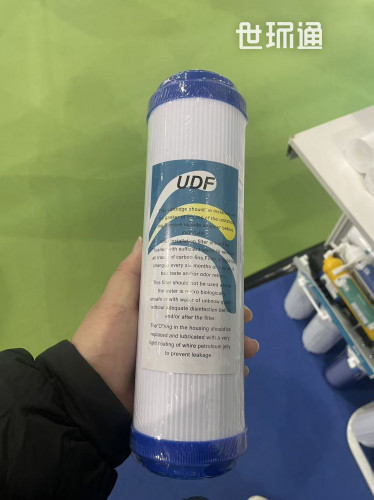 图片说明:这是一支 10 寸标准规格的 UDF 颗粒活性炭滤芯,整体为圆柱形,白色外壳带竖条纹结构,两端为蓝色食品级塑料端盖,标签清晰标注了 “UDF” 及安装使用说明。