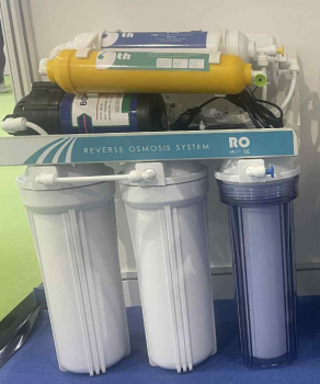 图片说明:这是一款经典的五级 RO 反渗透净水机,采用 “3+2” 结构设计。下方是三个前置滤瓶(2 个白色 + 1 个透明),用于安装 PP 棉、颗粒活性炭、压缩活性炭滤芯;上方集成了 RO 反渗透膜和后置活性炭滤芯,其中黄色的 RO 膜壳是显着特征。整机无压力表,结构简洁紧凑。