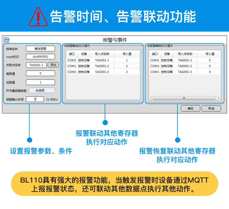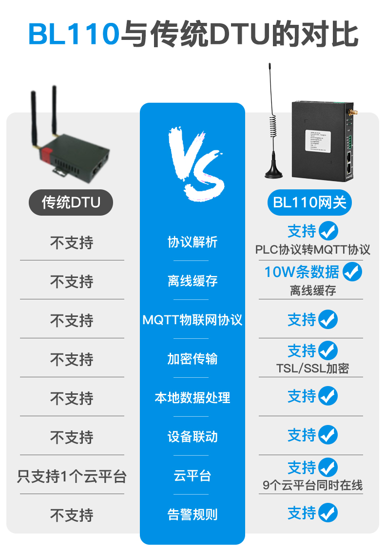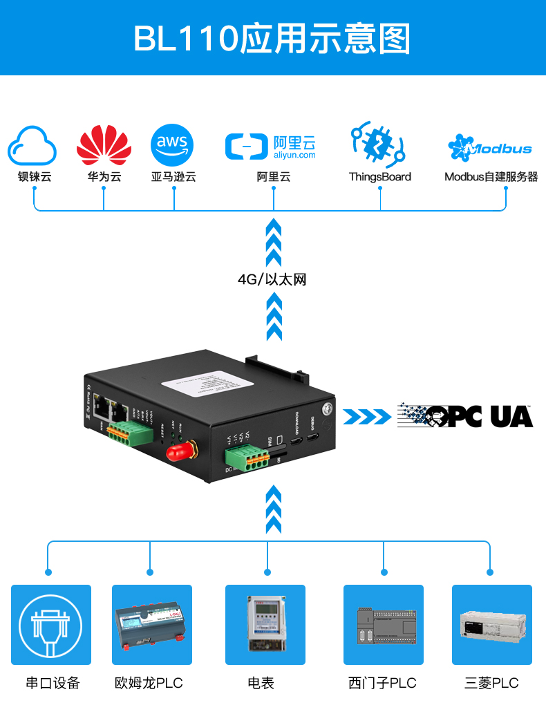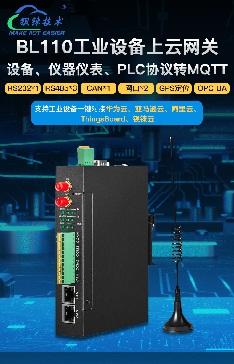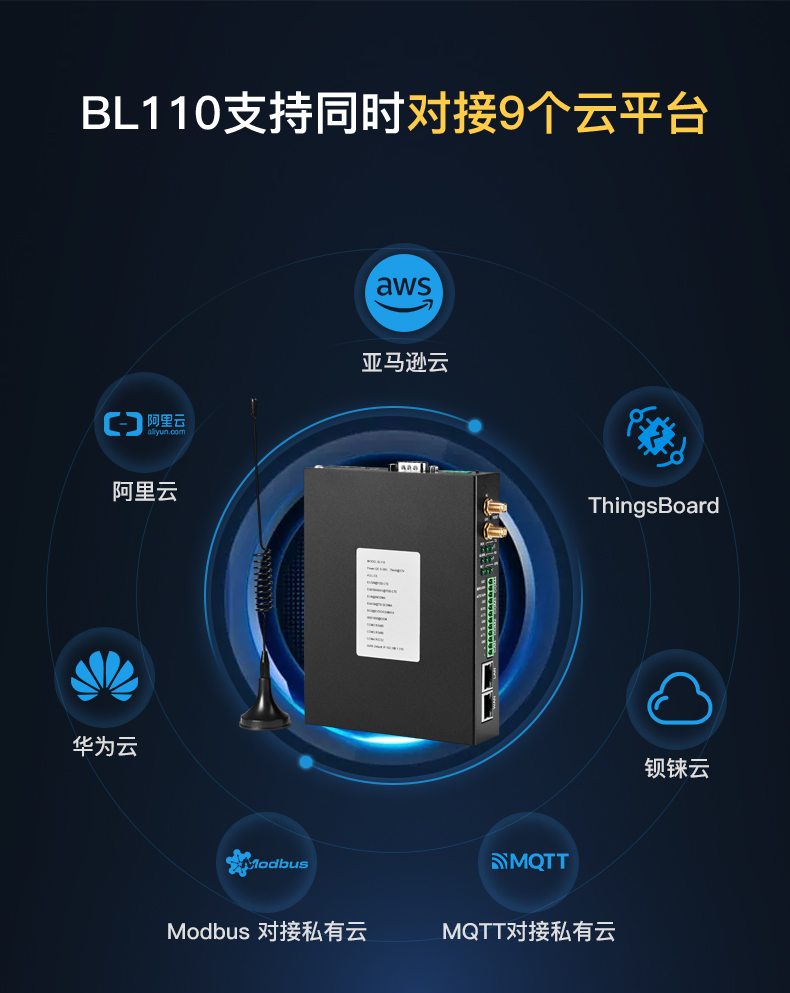 BL110支持OPC UA,支持MQTT协议、Modbus RTU协议、Modbus TCP协议、BACnet IP协议,方便用户快速把多种工业设备接入云平台如:华为云IoT、AWS IoT、阿里云IoT、ThingsBoard、钡铼云等云平台,同时也可以接入