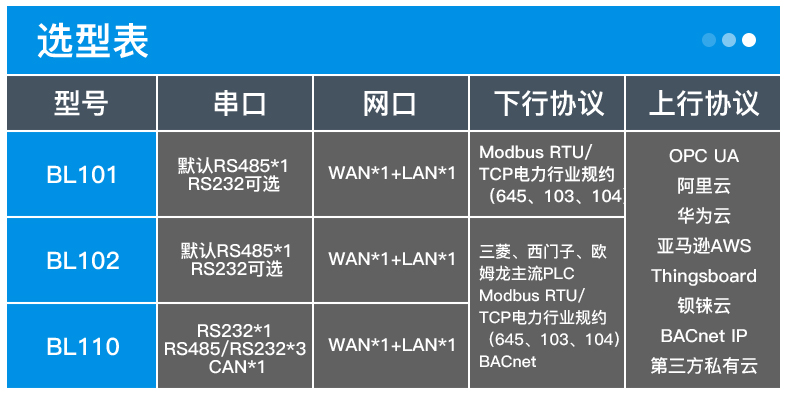 上行支持:Modbus TCP、MQTT、OPC UA、BACnet/IP、华为云IoT、阿里云IoT、AWS IoT、ThingsBoard、钡铼云等协议。