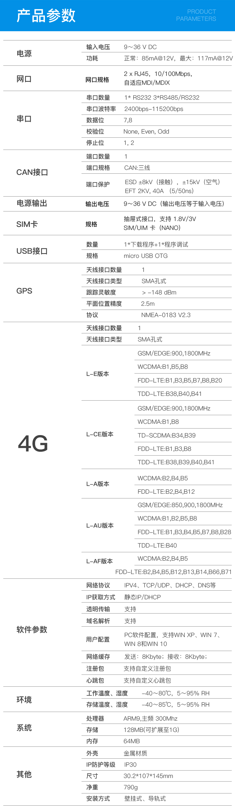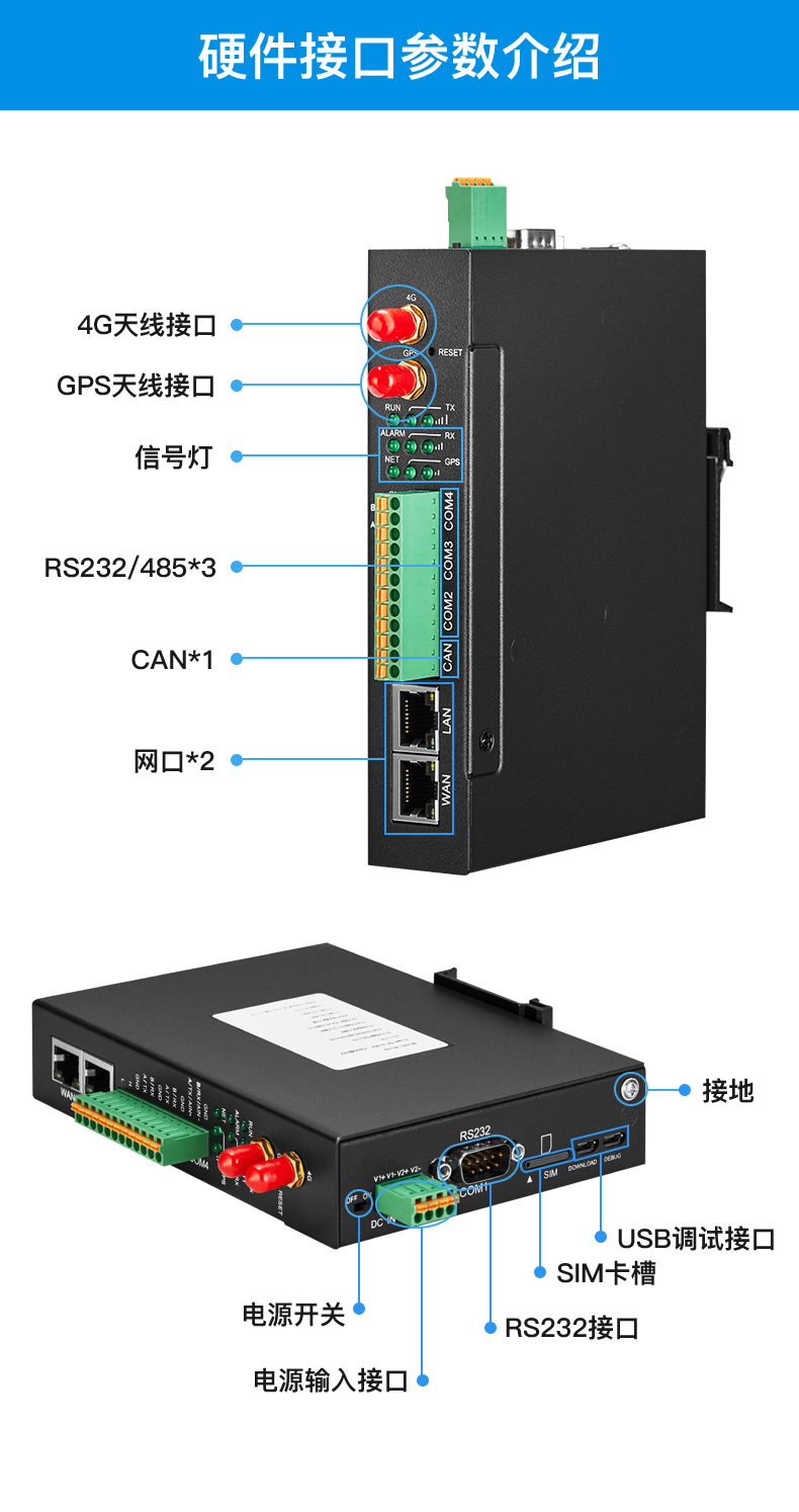 采用嵌入式 Linux 系统开发的产品,具有高度的稳定性。提供4路串口输入(1路RS232串口+3路RS485/RS232可选串口),1路CAN口输入,2路以太网口(WAN口和LAN口)以及2路USB 接口,2路电源输入接口,支持SIM卡。以