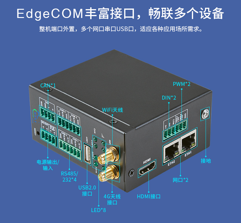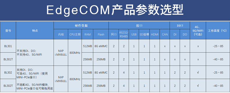 BL302嵌入式ARM工业边缘计算机是工业级坚固型工控机,采用NXP的高性能处理器I.MX6ULL,搭配先进的ARM Cortex-A7构架,运行速度高达800MHz,具有高度的稳定性。本产品提供4路RS485/RS232,1路CAN口,2路网口,2路DI口,2路PWM口输出,2路RJ45以太网LAN口以及1路USB 接口,1路电源输入/输出接口、1路HDMI视频显示接口。广泛应用于物联网、工业物联网、数字化工厂、工业自动化、能源监测 、智慧安防 、车载 、轨道交通 、 充电桩 、人机交互等领域。