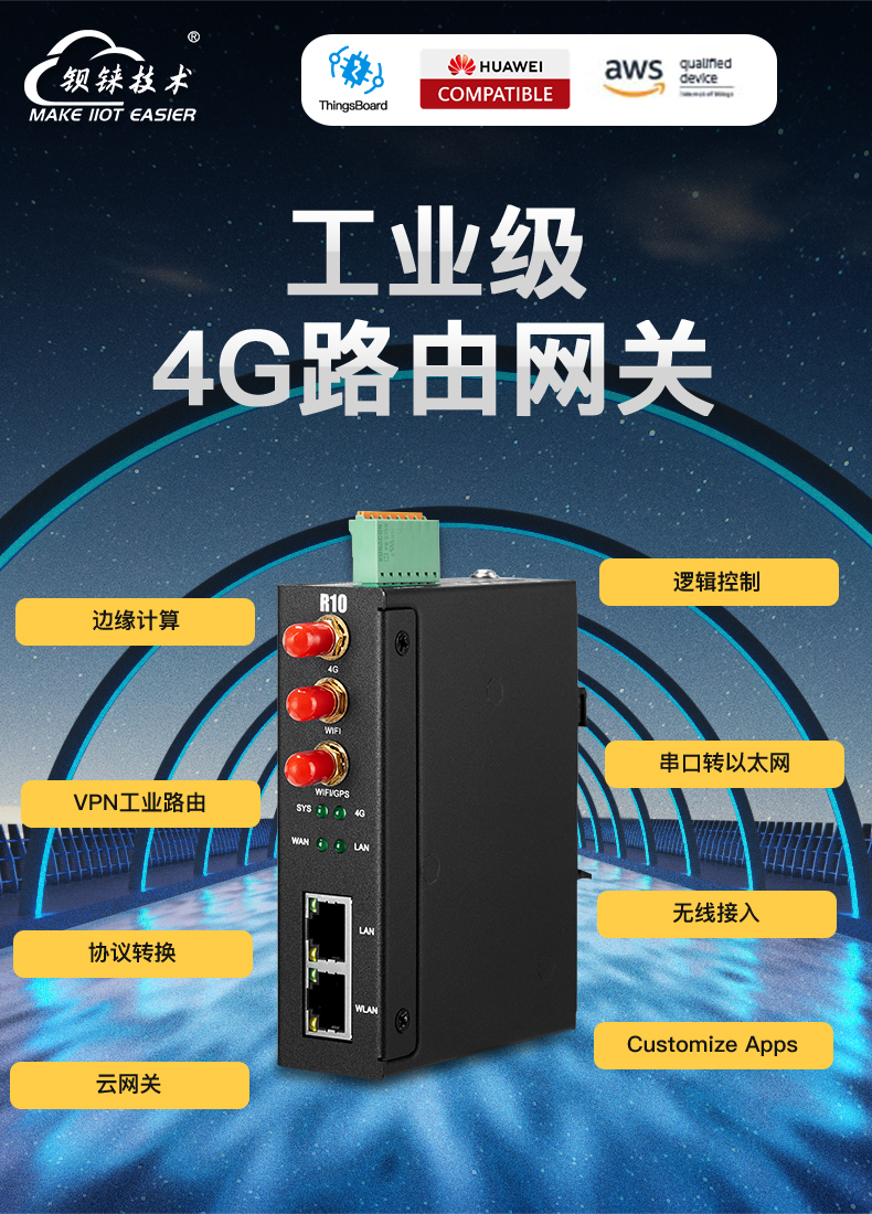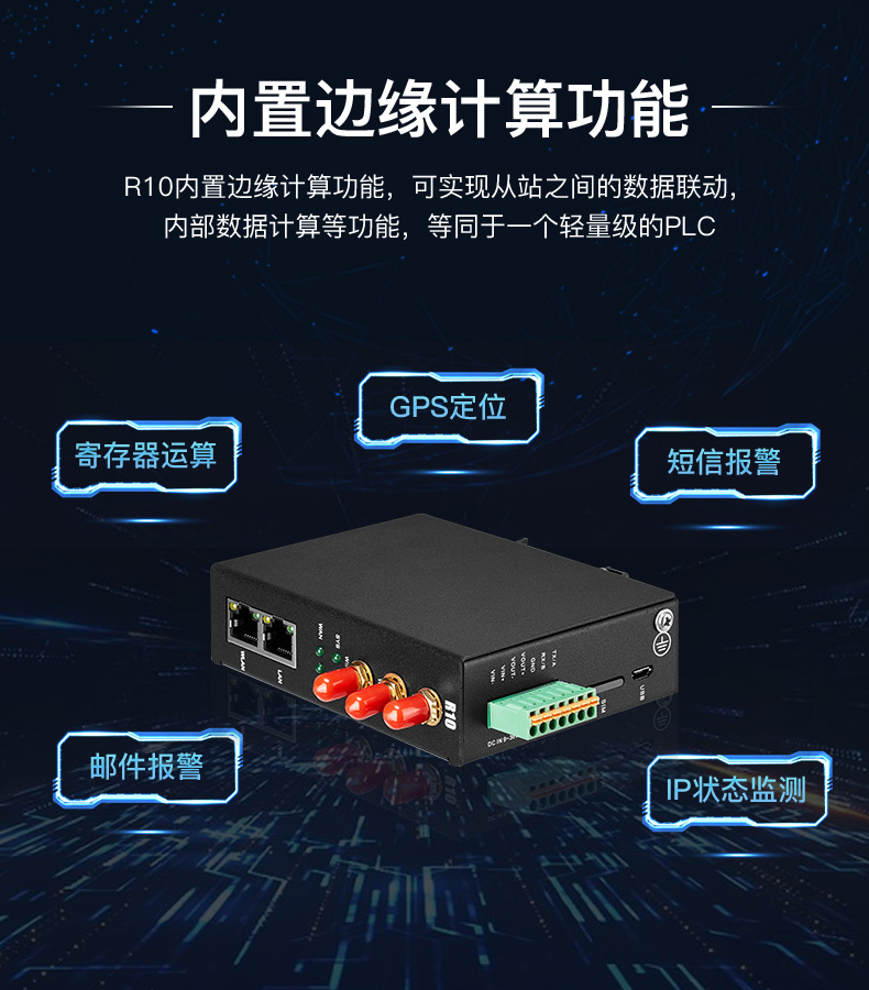 R10A高性能工业级边缘计算蜂窝网路由器采用高性能32位处理器,基于Linux系统开发。该边缘计算路由器支持GSM/GPRS/GDGE/WCDMA/HSPA+/LTE等2G/3G/4G网络,通过无线连接为设备提供高速无线网带宽,并且它有联网断线自动监测、拨号失败自动重启、定时重启等功能以保证网络的稳定连接。同时该路由器内置短信控制、VPN、RS485/RS232串口等功能,可以对接多种终端设备。