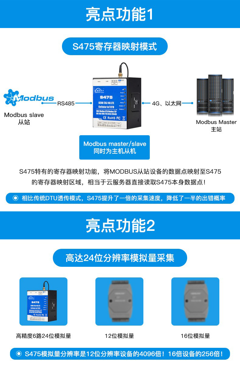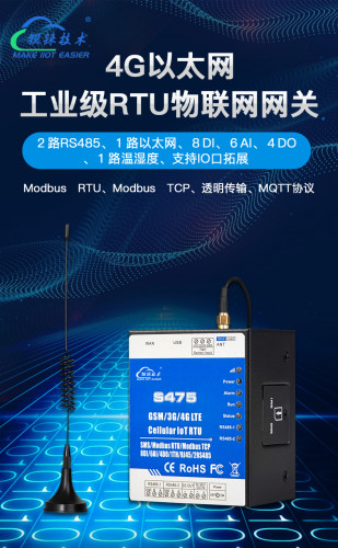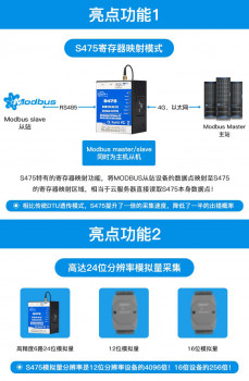 S475/S475E系列内嵌工业级GSM/GPRS/3G/4G 通信模块,集成稳定可靠的32 位高性能微处理器MCU,基于uCOSII嵌入式实时操作系统。设备支持Modbus Slave 功能,也支持Modbus Master 主站功能,可扩展多达320个数据点的数据采集,包括数字量输入、数字量输出、模拟量数据采集以及仪表数据的读写、异常时短信报警,实现Modbus RTU短信报警网关的功能。用户可以根据应用场合的特殊需要,预先配置各种高低限参数,当触发后,无需亲临现场,无线物联网控制器会自动通过无线的GSM、GPRS、3G、4G 无线网络,以短信、微信、拨打电话通知用户以及传输数据到监控中心。