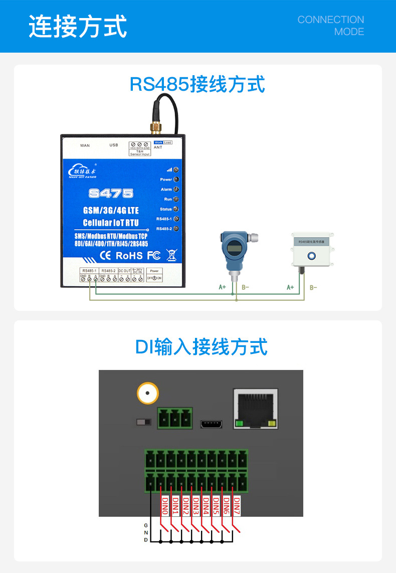 S475/S475E系列支持多种通信方式,包括短信、RS485、语音拨号、GPRS/3G/4G 无线数据网络四种告警方式,同时支持实时的钡铼IoT RTU 通信协议、Modbus RTU over TCP 协议、Modbus TCP 协议、MQTT协议以及透明传输功能,方便用户快速接入第三方服务器或云平台或SCADA。