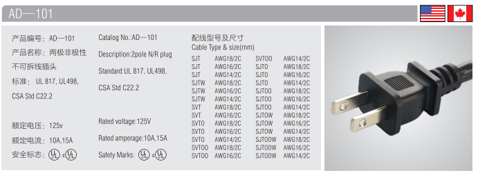 ①、美标插头特点:美标插头的电压为120V 50/60HZ,按结构分为两芯线、三芯线和极性、非极性。出口美国的电源插头铜片必须要套有橡胶套;插头两极极性的连接方式:极性插头脚大的为零线,脚小的为火线(电源线凹凸面为零、线圆面为火线);