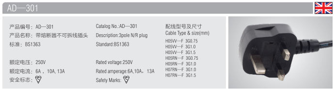 英式插头是三平方英尺,有“E,L,N”三极,E(地球)是极地地,L(实时)是火线,N(空)是非常零线,按照“左右零”在火灾中间,插头上一般会有标志。英国插头上还标有相应的电流和电压值,熔断的英式插头上会标有“FUSED”字样。三针铜英式插头的脚具有相同的间距,L型和N极引脚封装起来以保护安全。