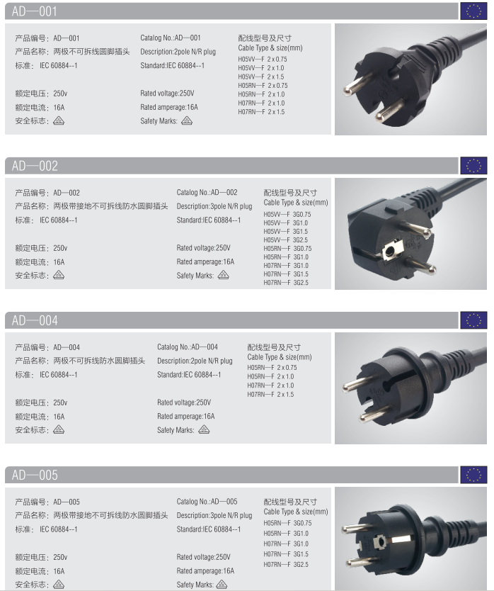 欧洲国家在使用电器插头和电源线标准方面,主要依据CE认证体系进行规范。欧标插头(European Standard Plug)是指符合欧洲不同国家电器插座统一标准的插头。按照欧标,插头分为二孔和三孔两种类型。其中,二孔为线路和零线,三孔为线路、零线和地线。欧标插头的特点是具有标准化、互换性强、安全牢固、外型美观、防火防爆等优点。