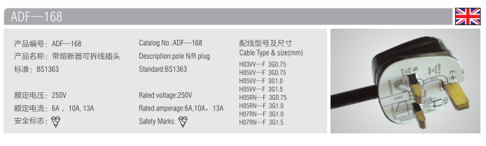 英式插头是三平方英尺,有“E,L,N”三极,E(地球)是极地地,L(实时)是火线,N(空)是非常零线,按照“左右零”在火灾中间,插头上一般会有标志。英国插头上还标有相应的电流和电压值,熔断的英式插头上会标有“FUSED”字样。三针铜英式插头的脚具有相同的间距,L型和N极引脚封装起来以保护安全。
