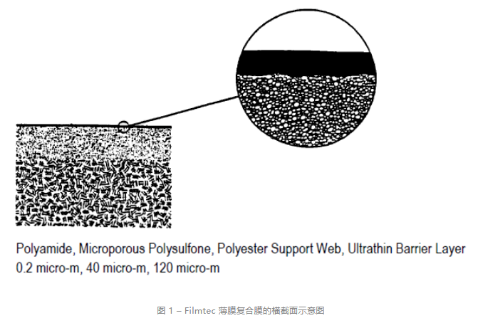 最常用的反渗透膜通常由薄膜复合膜组成,该复合膜由三层组成:聚酯支撑网、微孔聚砜夹层和顶面上的超薄聚酰胺阻挡层。