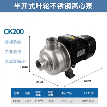 泵的水力部件为半开式叶轮,适用于食品行业、工业生产中循环清 洗系统或洗涤行业中的清洗设备,输送含有悬浮固体颗粒或对不锈 钢(SUS304)无明显腐蚀作用的非易燃易爆液体。