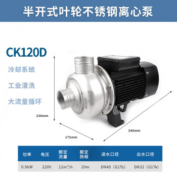 泵的水力部件为半开式叶轮,适用于食品行业、工业生产中循环清 洗系统或洗涤行业中的清洗设备,输送含有悬浮固体颗粒或对不锈 钢(SUS304)无明显腐蚀作用的非易燃易爆液体。