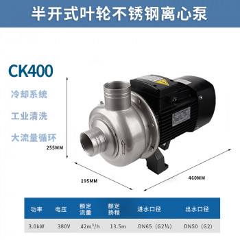 泵的水力部件为半开式叶轮,适用于食品行业、工业生产中循环清 洗系统或洗涤行业中的清洗设备,输送含有悬浮固体颗粒或对不锈 钢(SUS304)无明显腐蚀作用的非易燃易爆液体。