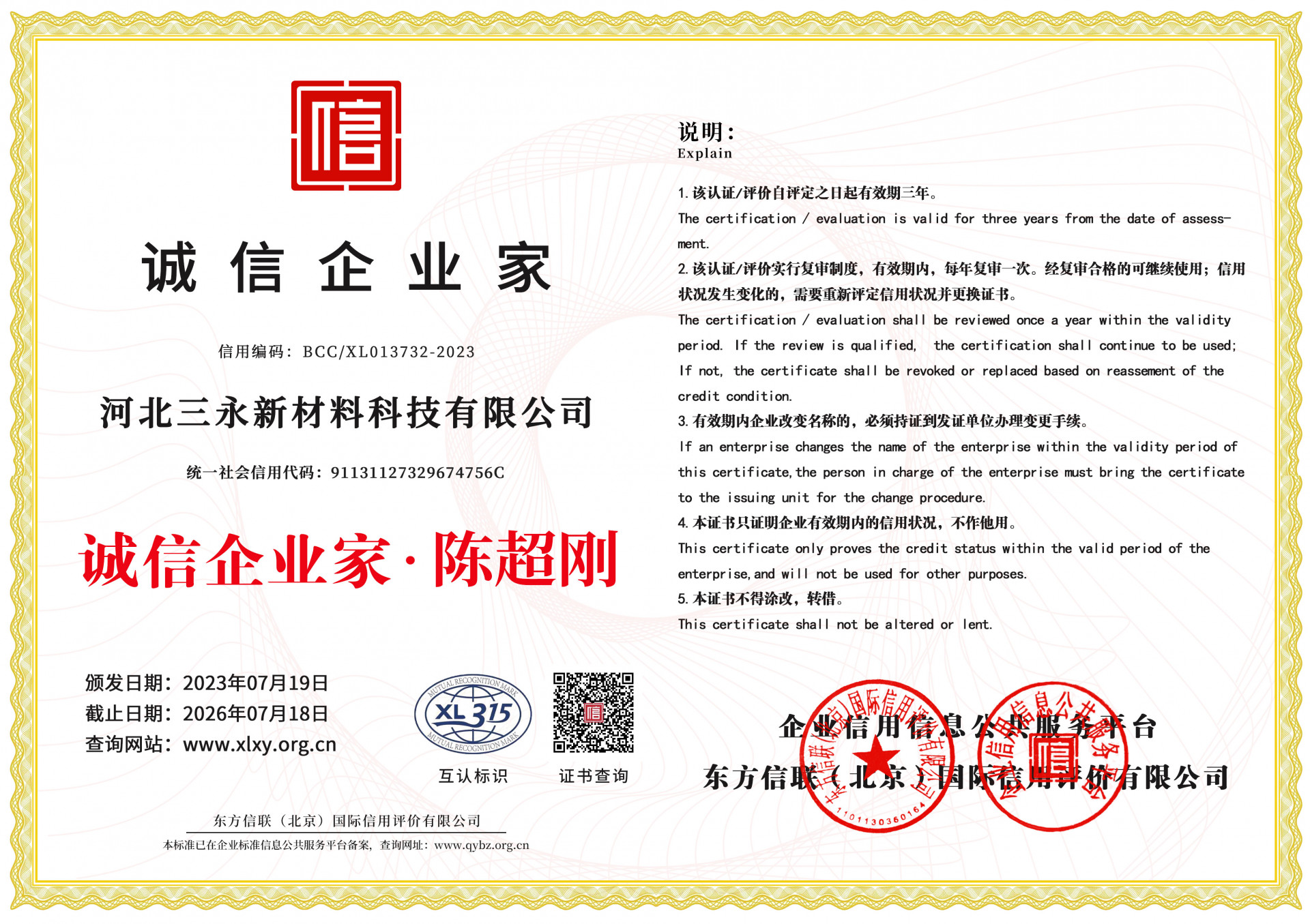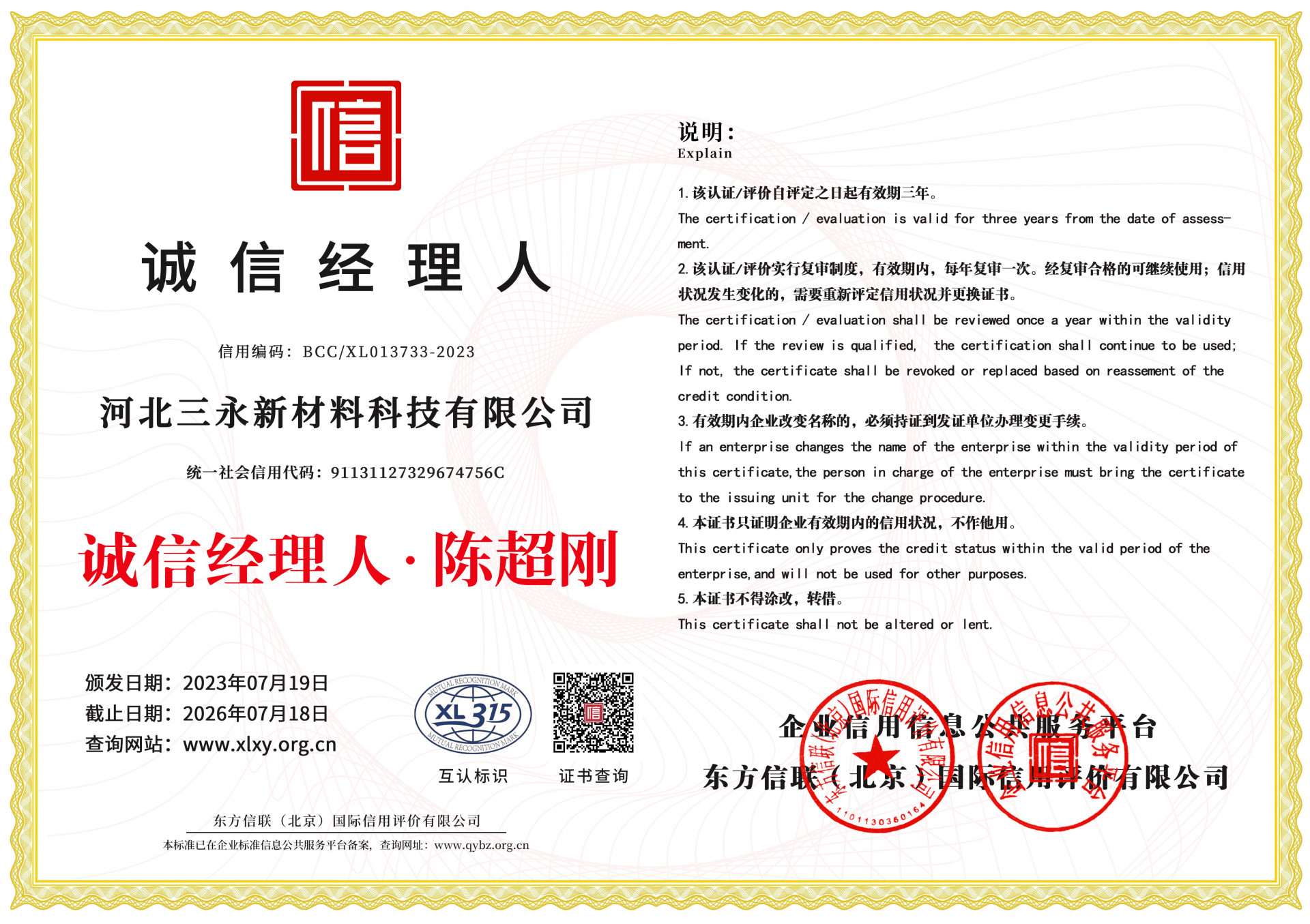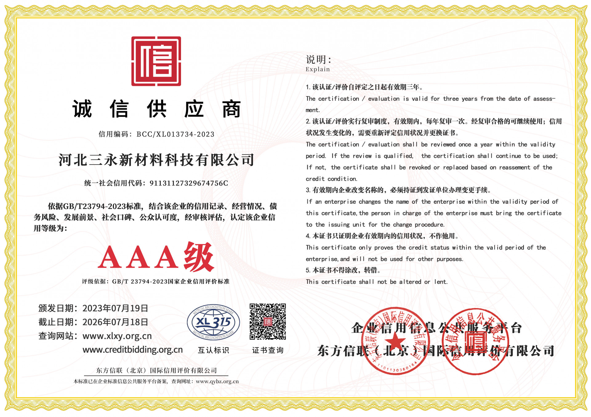 发证机构: 东方信联(北京)国际信用评价有限公司 发证时间: 2023-07-19