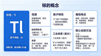 废水中的铊主要以一价铊(Tl⁺)、少量三价铊(Tl³⁺) 阳离子形态存在。