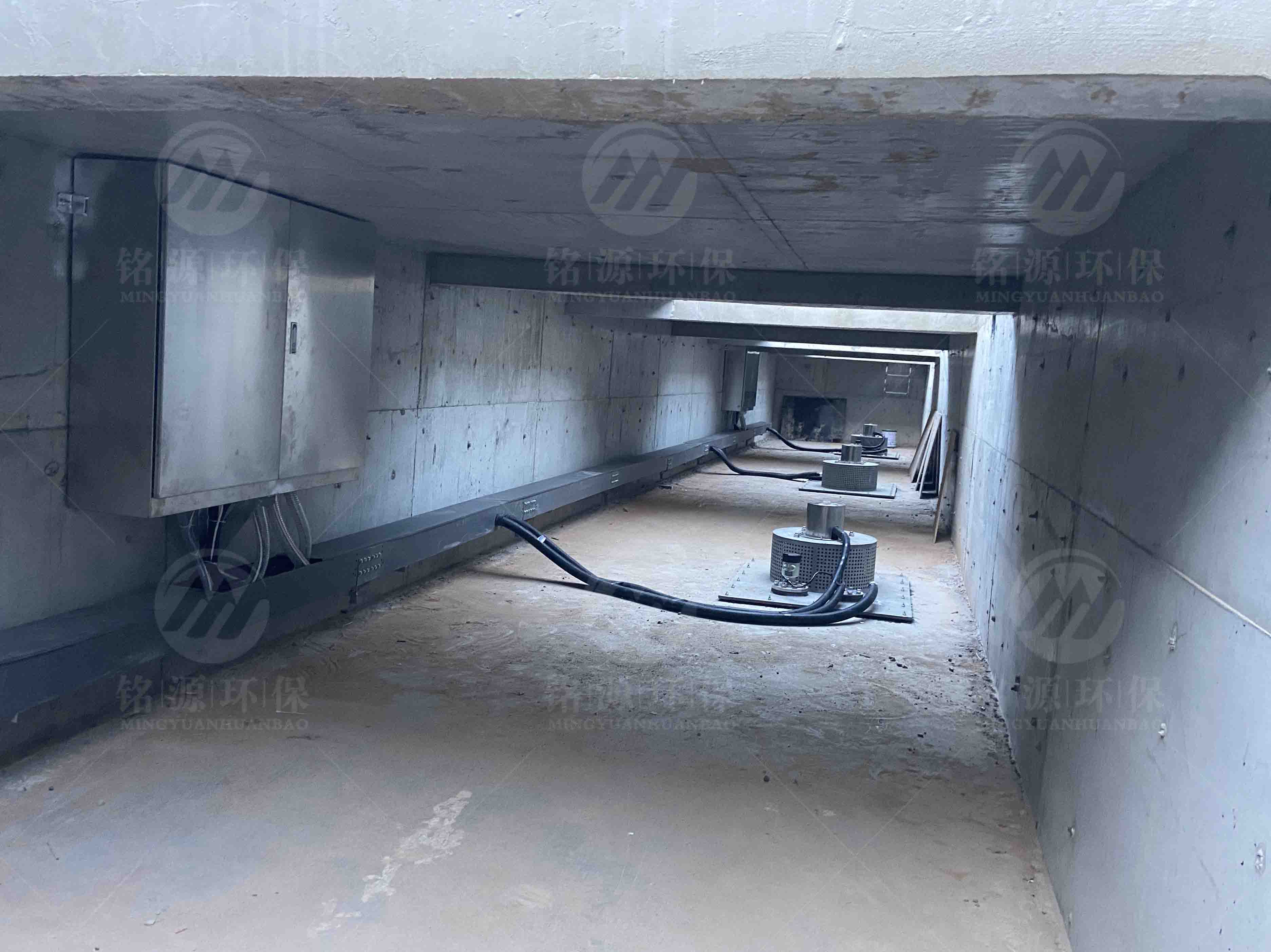 Myuan-VFS真空冲洗系统借由真空系统和控制阀 门组的帮助,该系统可以吸收足量的水体并保持在一定的高度。由此产生足够的势能.待水池排空后。释放素水室内水体,水体的势能转化为动能,产生强力的冲刷水流,把水池内残留的沉淀物携带至集水坑内并排至污水处理厂。