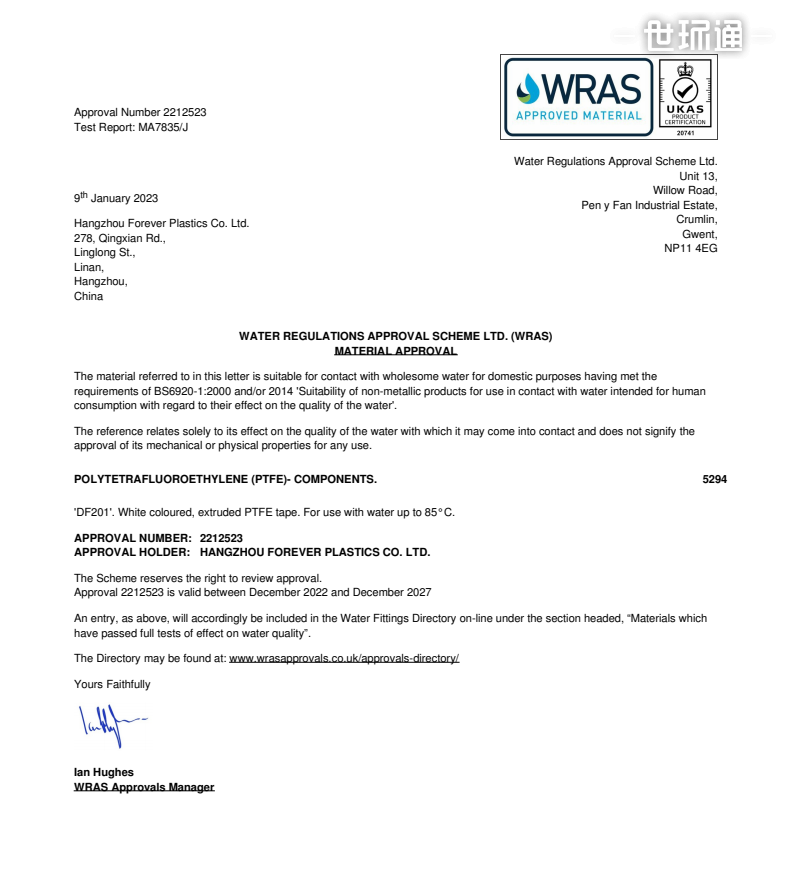 WRAS(Water Research Advisory Scheme)认证是指水务法规咨询计划,WRAS是英国饮用水安全方面的认证。 水务法规咨询计划(WRAS)是英国水工业的认证计划,由此计划认可的产品显示了它符合1999年供水系统(水配件)的法规和其修订版的要求。 计划的主要目标是避免水的:浪费 误用 滥用 不当的消费,不正确度量或污染物 此项认证是通往英国市场的必须许可,虽非强制,但已是惯例,大凡水公司在提供水源时必需验收的手续之一是查看是否有符合相关标准要求的认证,WRAS的认可是最有说服力的证明,没有的将没有供水资格。 证书图片