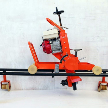 NCM-4.0型道岔打磨机由下列主要部件组成:安装有四个带单轮缘滚轮能在轨道上移动的底架。安装有四个带双轮缘滚轮能在底架上沿垂直轨道方向移动的灵活的磨削装置。钢制的防护罩对操作人员起防护作用。可以迅速更换碗形砂轮。两个人即可很容易把NCM-4.0型道岔打磨机抬下线路。