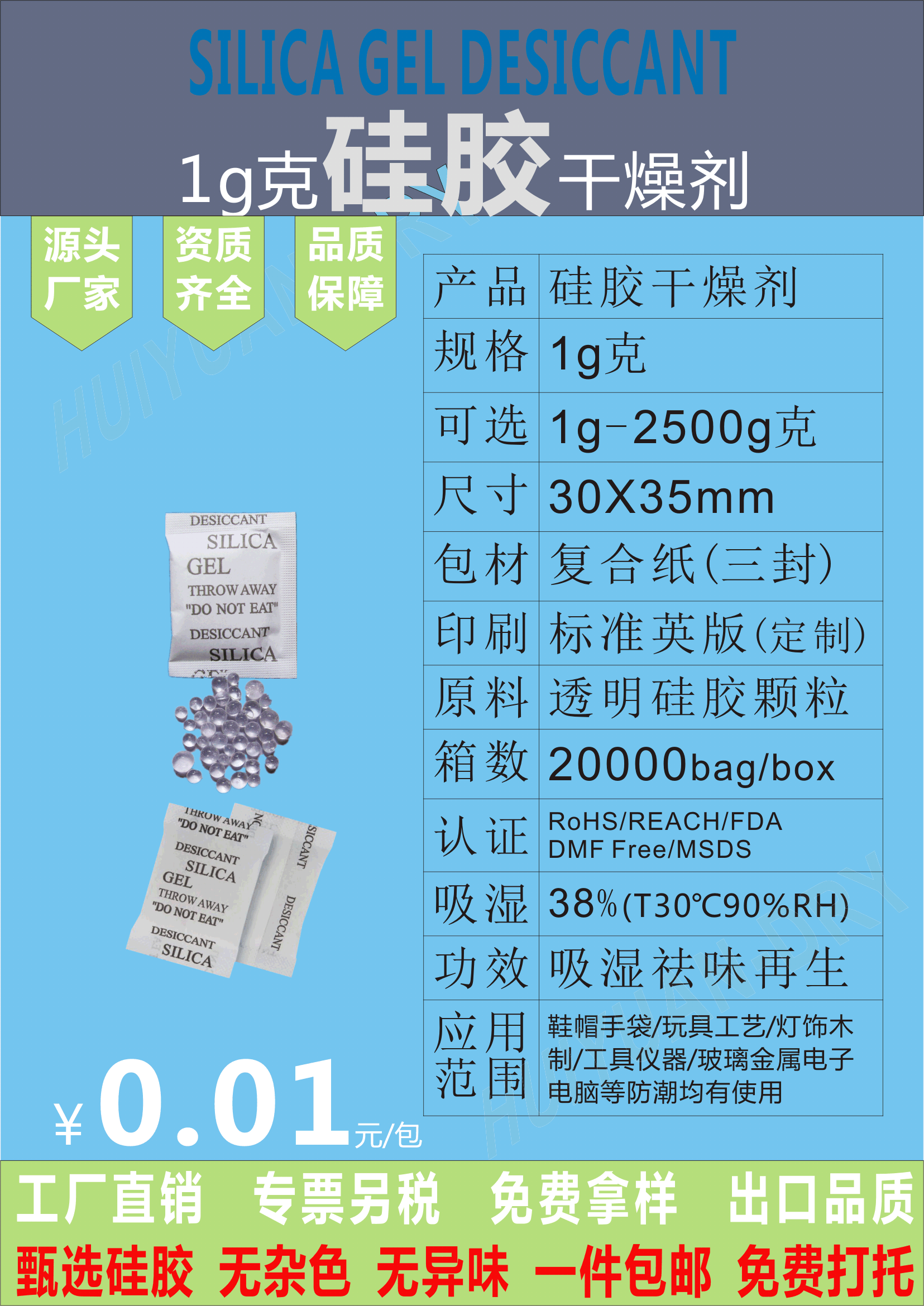 新品 江门2g克皮革服装干燥剂透明防潮珠江门惠源包装材料厂家生产供应