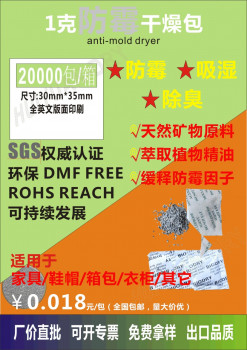 防霉抗菌包是以天然化学性能稳定的矽酸铝纳米防霉阳离子为吸湿载体,遇到空气中的潮气主动释放抗菌因子,真正做到有效释放,适用于包装内/密封空间的防霉抗菌后处理。可自然降解,属环保型防霉抗菌剂。在室温及一般湿度下吸附性能高,具有吸附活性,饱和吸湿率可达自身重量的300%(25,RH=100%),是普通硅胶干燥剂的10-20倍,有效控湿时间90天。有静态减湿和异味去除等功效。包装材料采用吸湿性强的棉纸材料,韧性好、抗刺穿、耐腐蚀,无返渗、抗静电。