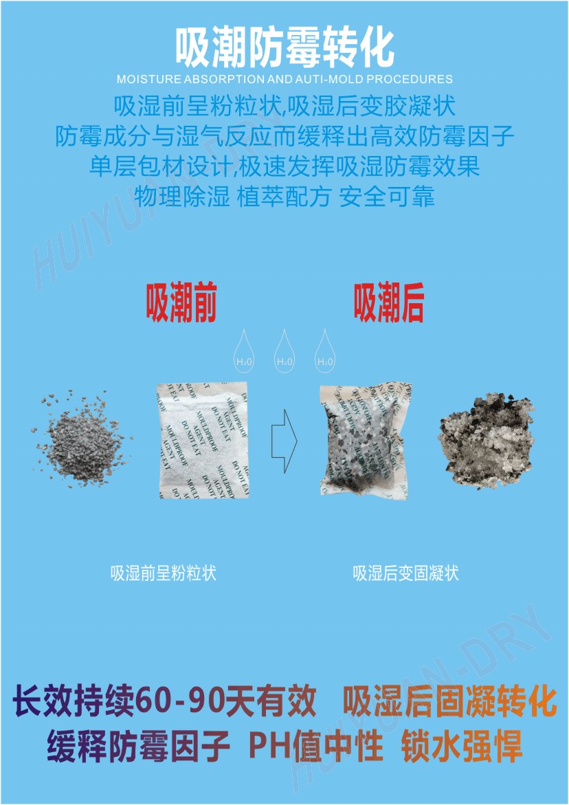 与目前市场上销售的其它类型干燥剂相比,不仅吸附速度快,吸附能力高,对水蒸汽和其他可冷凝的蒸汽具有较高的吸附能力且无毒、无色无味、无接触腐蚀性、无环境污染,可用于食品包装,对人体无害。其中加入的独特的专利阳银离子抗菌因子有效结合,实现“防潮、防霉、抗菌”三合一功效,在该领域独树一帜。