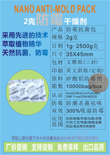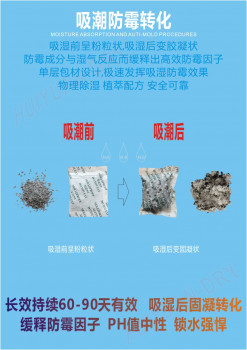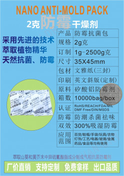防霉抗菌包是以天然化学性能稳定的矽酸铝纳米防霉阳离子为吸湿载体,遇到空气中的潮气主动释放抗菌因子,真正做到有效释放,适用于包装内/密封空间的防霉抗菌后处理。可自然降解,属环保型防霉抗菌剂。在室温及一般湿度下吸附性能高,具有吸附活性,饱和吸湿率可达自身重量的300%(25,RH=100%),是普通硅胶干燥剂的10-20倍,有效控湿时间90天。有静态减湿和异味去除等功效。包装材料采用吸湿性强的棉纸材料,韧性好、抗刺穿、耐腐蚀,无返渗、抗静电。