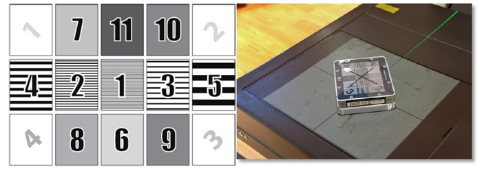 左图显示了 QC-3 模体的编号区域。拐角处的角度数字用于增加密度(数字 1 加工成深度为 1 mm 的铅块,数字 2 加工成深度为 2 mm 的铅块等)。图中的小数字表示区域编号。区域 1-5 是具有不同空间分隔的条形图,用于分析空间分辨率 f50。区域 6-11 包含厚度不断增加的铅或塑料(PVC)块。