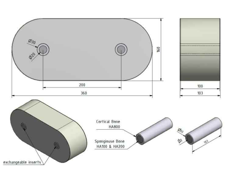 可互换的圆柱形插入物,指定的骨矿物质密度分别为每立方厘米 800(皮质骨)和 100 /200 毫克(松质骨)羟基磷灰石 (HA)。