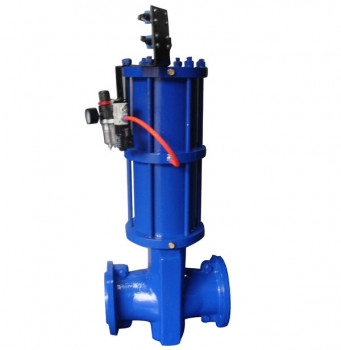 气动管夹阀结构:本阀门由左右阀体,橡胶管套、大小阀杆、上下闸板、导柱等零件组成。工作原理:当顺转手轮时,使大小阀杆同时带动上下闸板,压缩管套,进行关闭,反转即行开启,这样,闸板在导柱之间上下往复完成阀门开闭工作。另外,因橡胶管套承力,因此在开关时,操作人员旋转手轮时只要感到适量抵触,均己达到开闭点,切勿尽力或多人辅助,禁用其他工具开闭。气动管夹阀适用化工,石油、发电、碱厂、选矿、水泥、选煤、非金属等行业,可控制管路浓度砂粒状流量与截止。