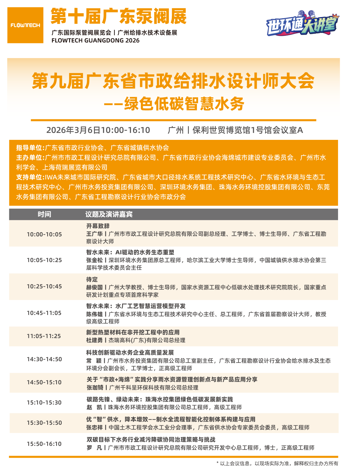 为汇聚行业智慧、共享前沿成果,广东省市政行业协会、广东省城镇供水协会、广州市水利学会定于2026年3月6日在广州共同举办第九届广东省市政给排水设计师大会。本次会议以 “绿色低碳智慧水务” 为主题,搭建技术交流与经验分享平台,助力水务行业破解发展难题,探索高效、低碳、智能的可持续发展路径。