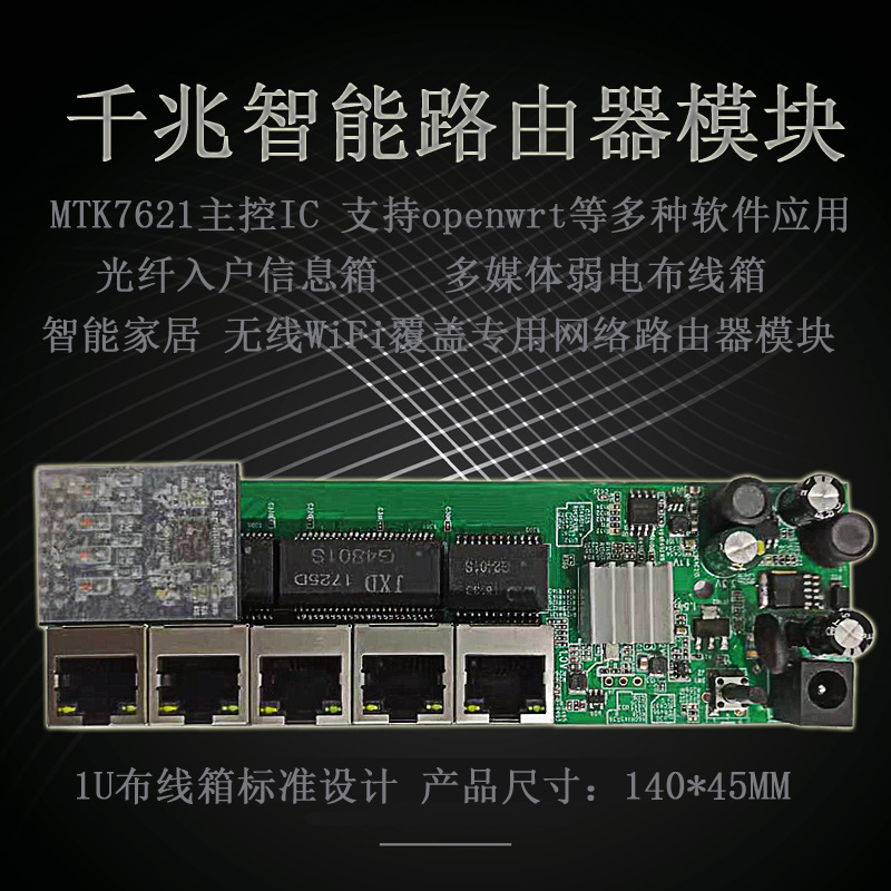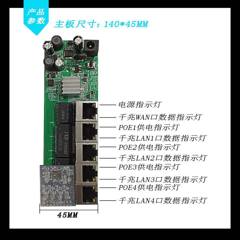 主板采用布线箱1U标准设计,产品尺寸140*45MM,此主板采用兼容性设计,网口可选用180度直插式和90度侧式两种,可兼容布线箱体式外壳与桌面式外壳