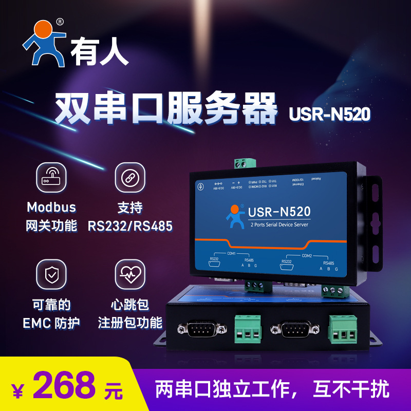 有人双串口服务器RS232/485转以太网口设备通讯物联网USR-N520