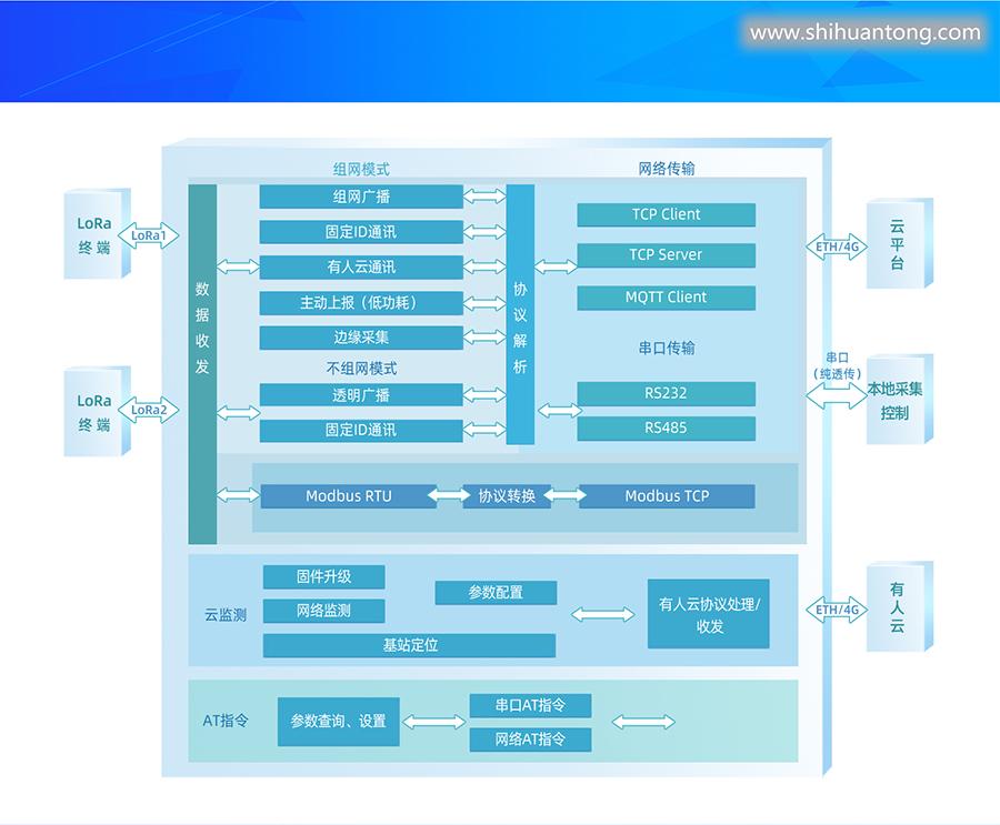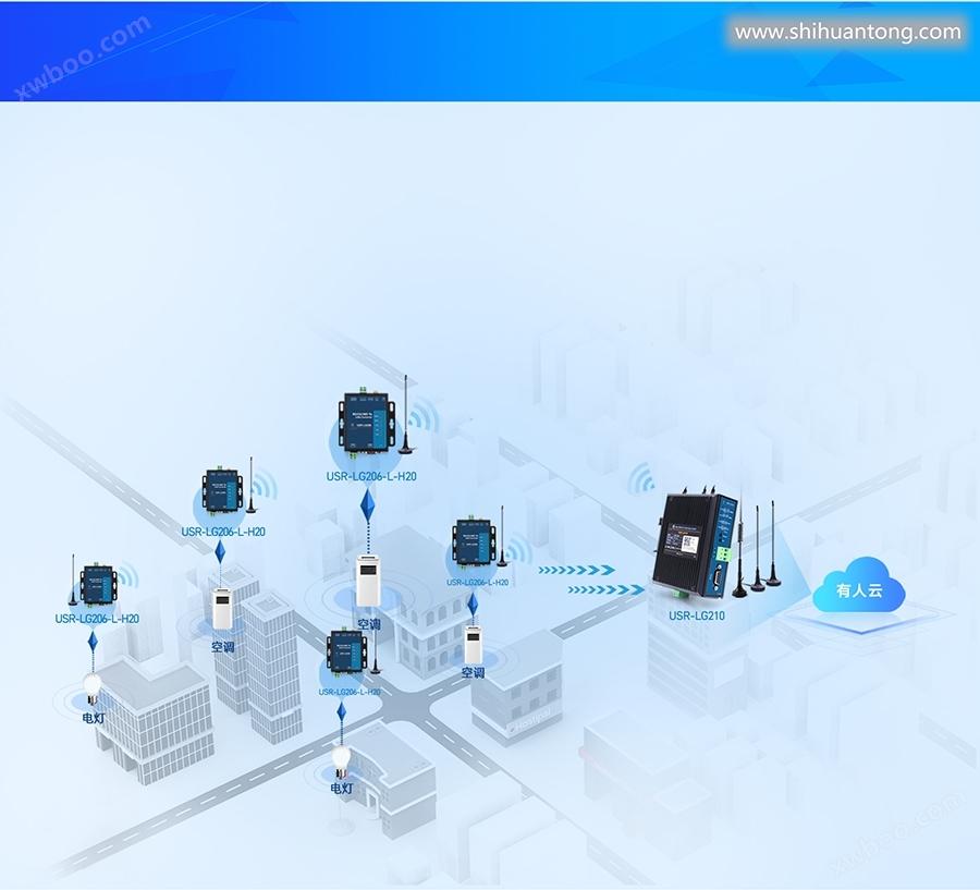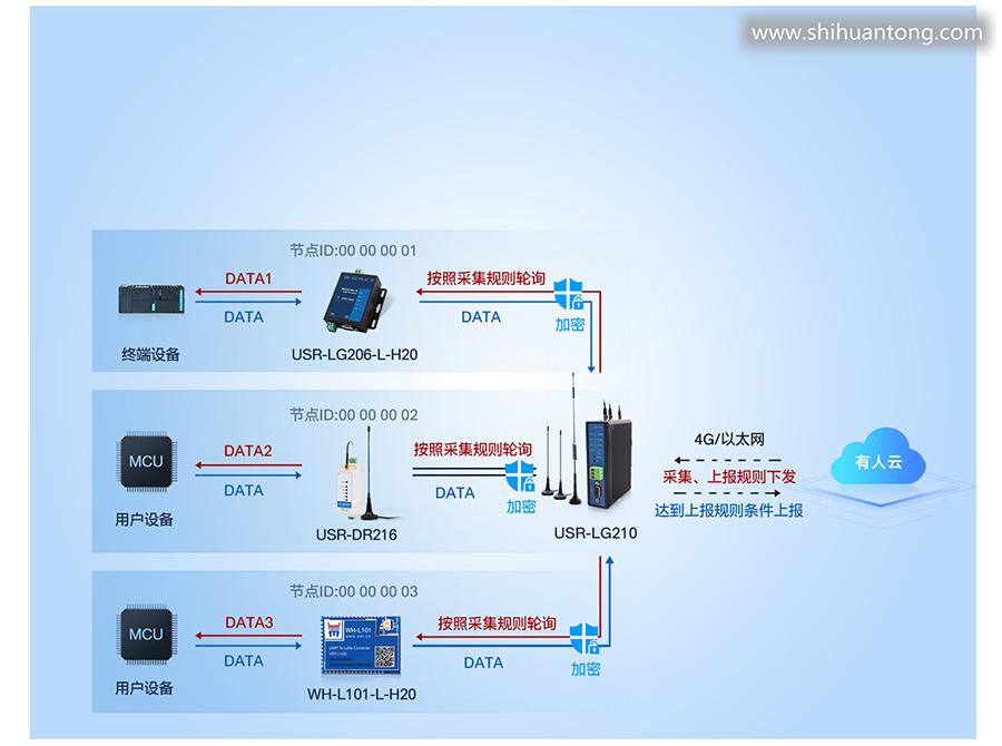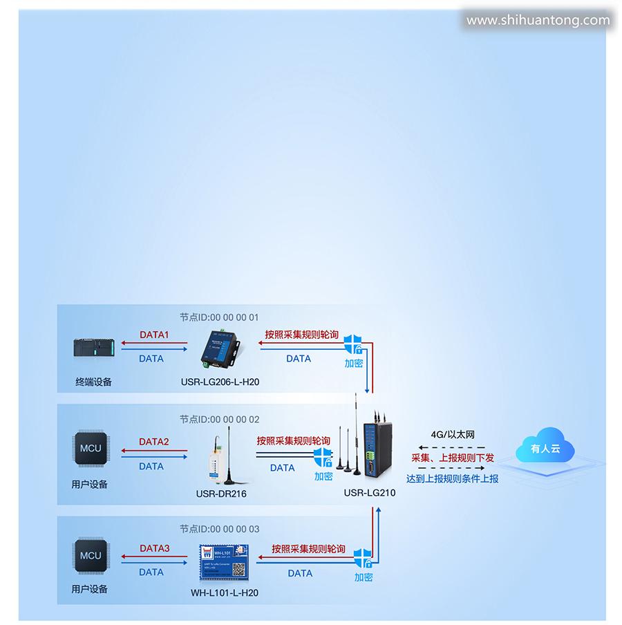 组网模式下,有人云平台将采集规则和上报规则下发至LG210网关,网关采集的