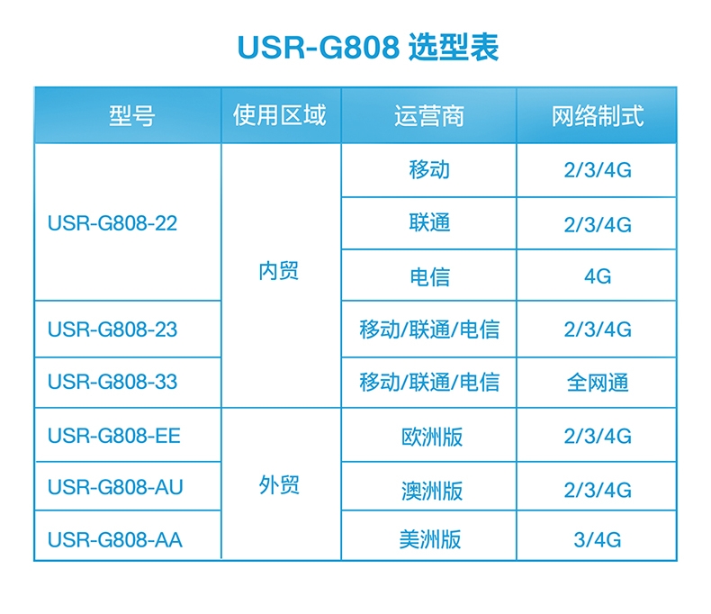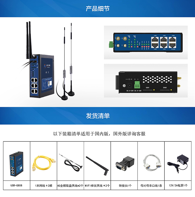 | 产品名称 | USR-G808-33 | 全网通双卡4G工业无线路由器 |