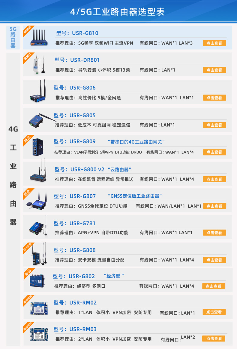 | 产品名称 | USR-G808-23 | 双卡4G工业无线路由器 |
