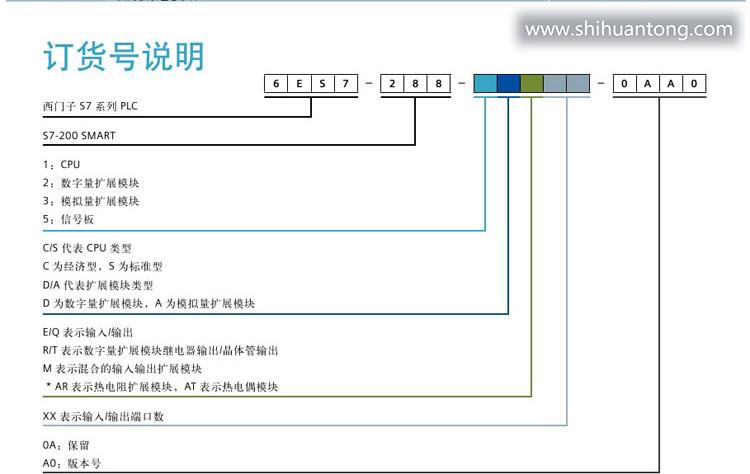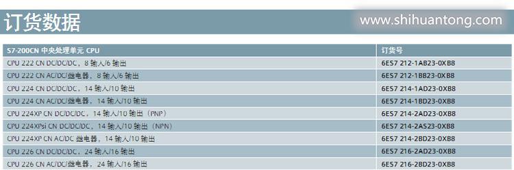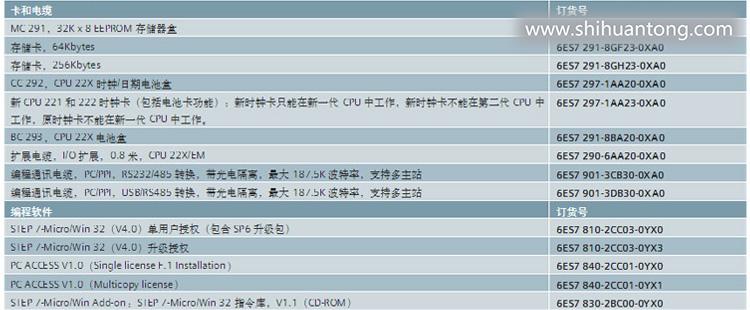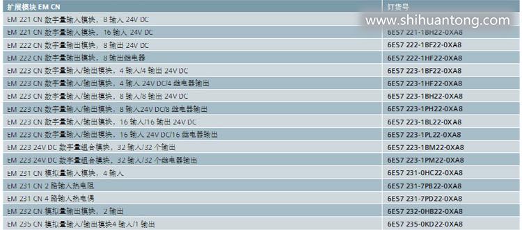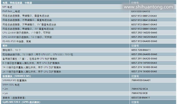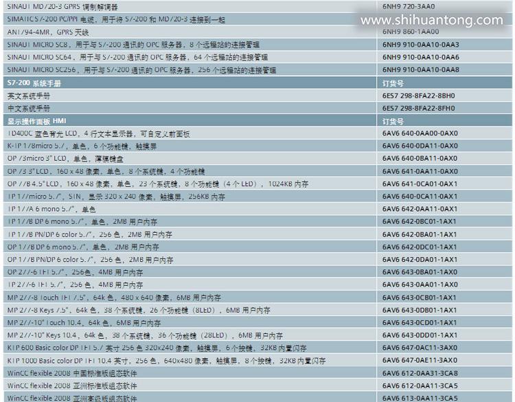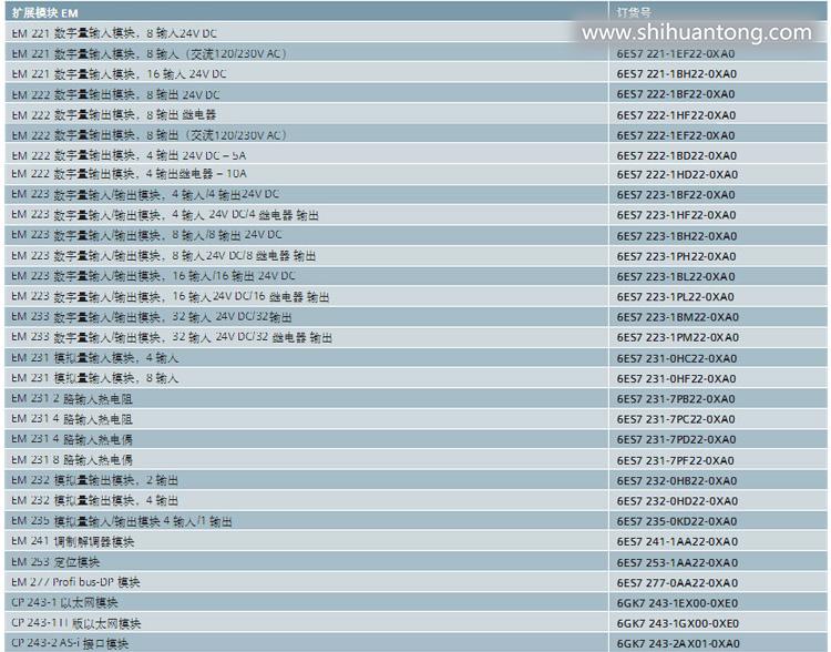 西门子S7-300系列订货号 电源模板 6ES7 307-1BA00-0AA0 西门子电源模块(2A) 6ES7 307-1EA01-0AA0 西门子电源模块(5A) 6ES7 307-1KA02-0AA0 西门子电源模块(10A) CPU 6ES7 312-1AE13-0AB0 西门子CPU312,32K内存, 升级为6ES7312-1AE14-0AB0 6ES7 312-5BE03-0AB0 西门子CPU312C,32K内存 10DI/6DO 升级为6ES7312-5BF04-0AB0 6ES7 313-5BF03-0AB0 西门子CPU313C,64K内存 24DI/16DO / 4AI/2AO 升级为6ES7313-5BG04-0AB0 6ES7 313-6BF03-0AB0 西门子CPU313C-2PTP,64K内存 16DI/16DO 升级为6ES7313-6BG04-0AB0 6ES7 313-6CF03-0AB0 西门子CPU313C-2DP,64K内存 16DI/16DO 升级为6ES7313-6CG04-0AB0 6ES7 314-1AG13-0AB0 西门子CPU314,96K内存, 升级为6ES7314-1AG14-0AB0 6ES7 314-6BG03-0AB0 西门子CPU314C-2PTP 96K内存 24DI/16DO / 4AI/2AO 升级为6ES7314-6BH04-0AB0 6ES7 314-6CG03-0AB0 西门子CPU314C-2DP 96K内存 24DI/16DO / 4AI/2AO 升级为6ES7314-6CH04-0AB0 6ES7 315-2AG10-0AB0 西门子CPU315-2DP, 128K内存 升级为6ES7315-2AH14-0AB0 6ES7 315-2EH13-0AB0 西门子CPU315-2 PN/DP, 256K内存 升级为6ES7315-2EH14-0AB0 6ES7 317-2AJ10-0AB0 西门子CPU317-2DP,512K内存 升级为6ES7317-2AK14-0AB0 6ES7 317-2EK13-0AB0 西门子CPU317-2 PN/DP,1MB内存 升级为6ES7317-2EK14-0AB0 6ES7 318-3EL00-0AB0 西门子CPU319-3 PN/DP,1.4M内存 升级为6ES7318-3EL01-0AB0 内存卡 6ES7 953-8LF20-0AA0 西门子SIMATIC Micro内存卡 64kByte(MMC) 6ES7 953-8LG11-0AA0 西门子SIMATIC Micro内存卡128KByte(MMC) 6ES7 953-8LJ20-0AA0 西门子SIMATIC Micro内存卡512KByte(MMC) 6ES7 953-8LL20-0AA0 西门子SIMATIC Micro内存卡2MByte(MMC) 6ES7 953-8LM20-0AA0 西门子SIMATIC Micro内存卡4MByte(MMC) 6ES7 953-8LP20-0AA0 西门子SIMATIC Micro内存卡8MByte(MMC) 开关量模板 6ES7 321-1BH02-0AA0 西门子SM321开入模块(16点,24VDC) 6ES7 321-1BH10-0AA0 西门子SM321开入模块(16点,24VDC) 6ES7 321-1BH50-0AA0 西门子SM321开入模块(16点,24VDC,源输入) 6ES7 321-1BL00-0AA0 西门子SM321开入模块(32点,24VDC) 6ES7 321-7BH01-0AB0 西门子SM321开入模块(16点,24VDC,诊断能力) 6ES7 321-1EL00-0AA0 西门子SM321开入模块(32点,120VAC) 6ES7 321-1FF01-0AA0 西门子SM321开入模块(8点,120/230VAC) 6ES7 321-1FF10-0AA0 西门子SM321开入模块(8点,120/230VAC)与公共电位单独连接 6ES7 321-1FH00-0AA0 西门子SM321开入模块(16点,120/230VAC) 6ES7 321-1CH00-0AA0 西门子SM321开入模块(16点,24/48VDC) 6ES7 321-1CH20-0AA0 西门子SM321开入模块(16点,48/125VDC) 6ES7 322-1BH01-0AA0 西门子SM322开出模块(16点,24VDC) 6ES7 322-1BH10-0AA0 西门子SM322开出模块(16点,24VDC)高速 6ES7 322-1CF00-0AA0 西门子SM322开出模块(8点,48-125VDC) 6ES7 322-8BF00-0AB0 西门子SM322开出模块(8点,24VDC)诊断能力 6ES7 322-5GH00-0AB0 西门子SM322开出模块(16点,24VDC,独立接点,故障保护) 6ES7 322-1BL00-0AA0 西门子SM322开出模块(32点,24VDC) 6ES7 322-1FL00-0AA0 西门子SM322开出模块(32点,120VAC/230VAC) 6ES7 322-1BF01-0AA0 西门子SM322开出模块(8点,24VDC,2A) 6ES7 322-1FF01-0AA0 西门子SM322开出模块(8点,120V/230VAC) 6ES7 322-5FF00-0AB0 西门子SM322开出模块(8点,120V/230VAC,独立接点) 6ES7 322-1HF01-0AA0 西门子SM322开出模块(8点,继电器,2A) 6ES7 322-1HF10-0AA0 西门子SM322开出模块(8点,继电器,5A,独立接点) 6ES7 322-1HH01-0AA0 西门子SM322开出模块(16点,继电器) 6ES7 322-5HF00-0AB0 西门子SM322开出模块(8点,继电器,5A,故障保护) 6ES7 322-1FH00-0AA0 西门子SM322开出模块(16点,120V/230VAC) 6ES7 323-1BH01-0AA0 西门子SM323模块8点输入,24VDC;8点输出,24VDC模块 6ES7 323-1BL00-0AA0 西门子SM323模块16点输入,24VDC;16点输出,24VDC模块 模拟量模板 6ES7 331-7KF02-0AB0 西门子SM331模拟量输入模块(8路,多种信号) 6ES7 331-7KB02-0AB0 西门子SM331模拟量输入模块(2路,多种信号) 6ES7 331-7NF00-0AB0 西门子SM331模拟量输入模块(8路,15位精度) 6ES7 331-7NF10-0AB0 西门子SM331模拟量输入模块(8路,15位精度)4通道模式 6ES7 331-7HF01-0AB0 西门子SM331模拟量输入模块(8路,14位精度,快速) 6ES7 331-1KF01-0AB0 西门子SM331模拟量输入模块(8路, 13位精度) 6ES7 331-7PF01-0AB0 西门子SM3318路模拟量输入,16位,热电阻 6ES7 331-7PF11-0AB0 西门子SM3318路模拟量输入,16位,热电偶 6ES7 332-5HD01-0AB0 西门子SM332模拟输出模块(4路) 6ES7 332-5HB01-0AB0 西门子SM332模拟输出模块(2路) 6ES7 332-5HF00-0AB0 西门子SM332模拟输出模块(8路) 6ES7 332-7ND02-0AB0 西门子SM332模拟量输出模块(4路,15位精度) 6ES7 334-0KE00-0AB0 西门子SM334模拟量输入(4路RTD)/模拟量输出(2路) 6ES7 334-0CE01-0AA0 西门子SM334模拟量输入(4路)/模拟量输出(2路) 附件 6ES7 365-0BA01-0AA0 西门子IM365接口模块 6ES7 360-3AA01-0AA0 西门子IM360接口模块 6ES7 361-3CA01-0AA0 西门子IM361接口模块 6ES7 368-3BB01-0AA0 西门子连接电缆 (1米) 6ES7 368-3BC51-0AA0 西门子连接电缆 (2.5米) 6ES7 368-3BF01-0AA0 西门子连接电缆 (5米) 6ES7 368-3CB01-0AA0 西门子连接电缆 (10米) 6ES7 390-1AE80-0AA0 西门子导轨(480mm) 6ES7 390-1AF30-0AA0 西门子导轨(530mm) 6ES7 390-1AJ30-0AA0 西门子导轨(830mm) 6ES7 390-1BC00-0AA0 西门子导轨(2000mm) 6ES7 392-1AJ00-0AA0 西门子20针前连接器 6ES7 392-1AM00-0AA0 西门子40针前连接器 功能模板 6ES7 350-1AH03-0AE0 西门子FM350-1 计数器功能模块 6ES7 350-2AH00-0AE0 西门子FM350-2 计数器功能模块 6ES7 351-1AH01-0AE0 西门子FM351 定位功能模块 6ES7 352-1AH02-0AE0 西门子FM352 电子凸轮控制器+组态包光盘 6ES7 355-0VH10-0AE0 西门子FM355C 闭环控制模块 6ES7 355-1VH10-0AE0 西门子FM355S 闭环控制系统 6ES7 355-2CH00-0AE0 西门子FM355-2C 闭环控制模块 6ES7 355-2SH00-0AE0 西门子FM355-2S 闭环控制模块 6ES7 338-4BC01-0AB0 西门子SM338位置输入模块 6ES7 352-5AH00-0AE0 西门子FM352-5高速布尔处理器 6ES7 352-5AH00-7XG0 西门子FM352-5功能软件包 通讯模板 6ES7 340-1AH02-0AE0 西门子CP340 通讯处理器(RS232)