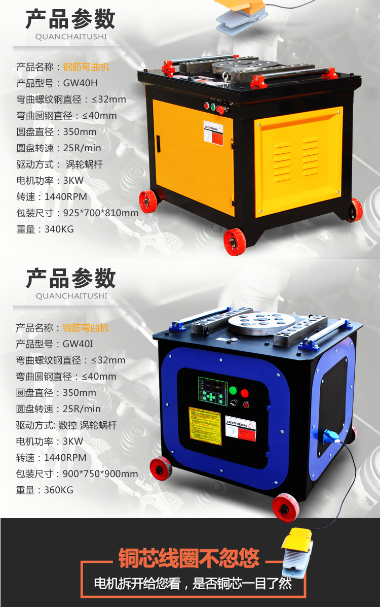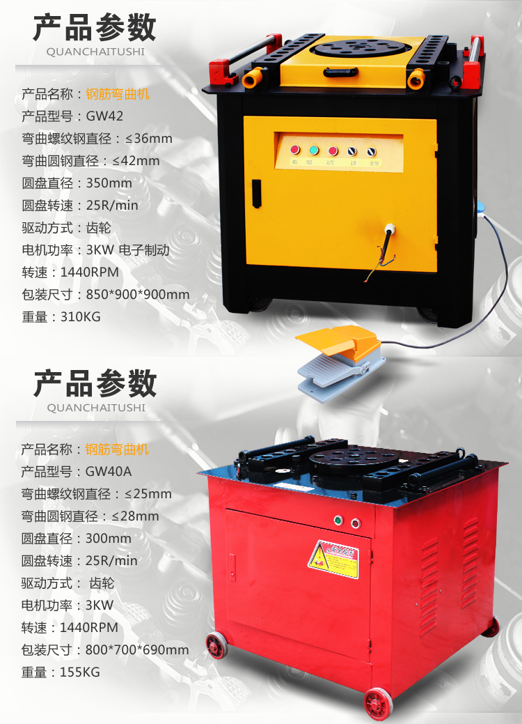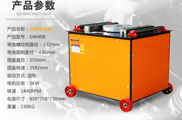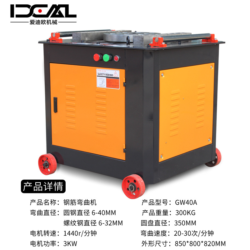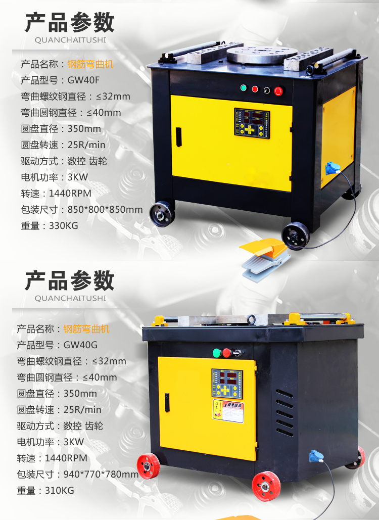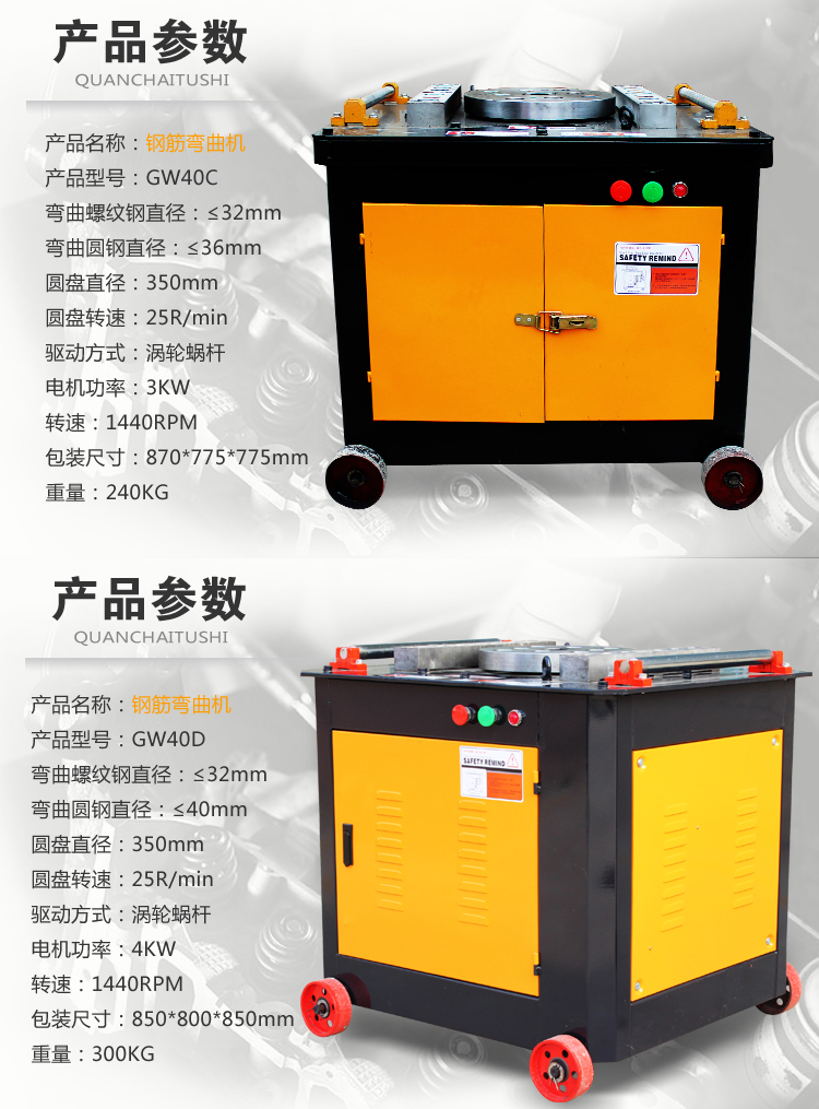 GW40型钢筋弯曲机技术参数 弯曲钢筋直径:圆钢(Q235-A) 6-40mm II级螺纹钢:8-36mm 工作盘直径:350mm 工作盘转速:5r/min 免费电话:400-822-8987 手机:联系人:18539013576