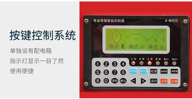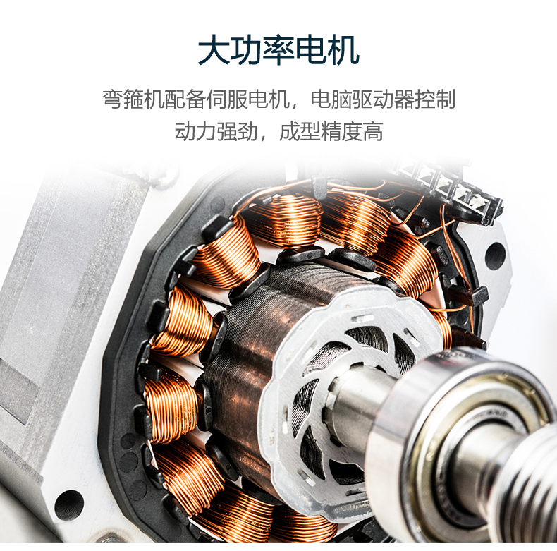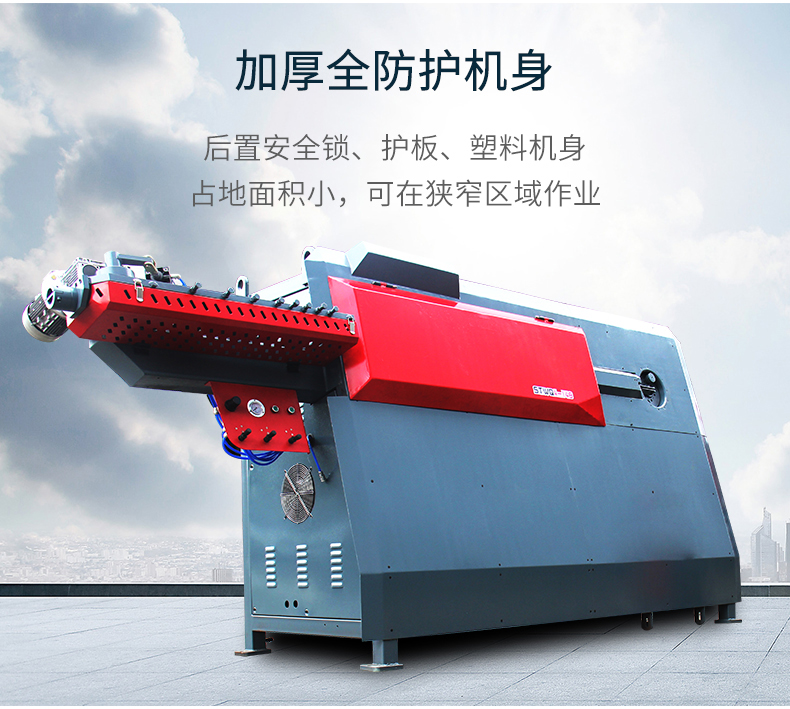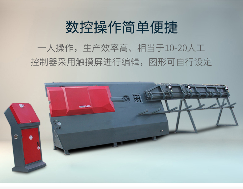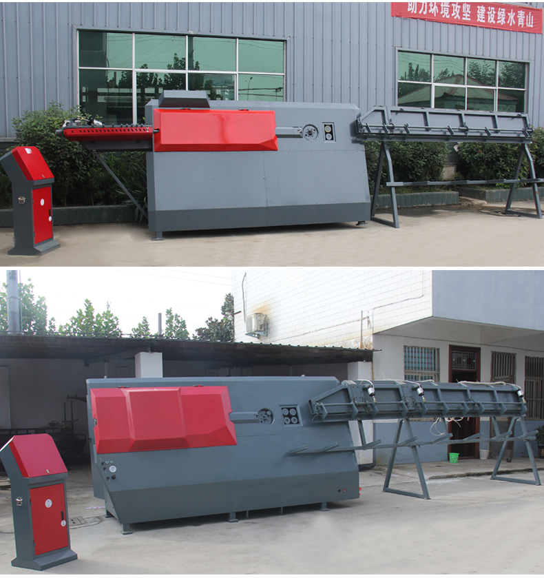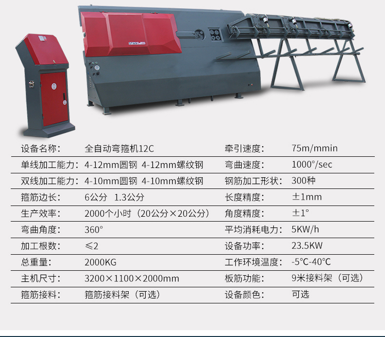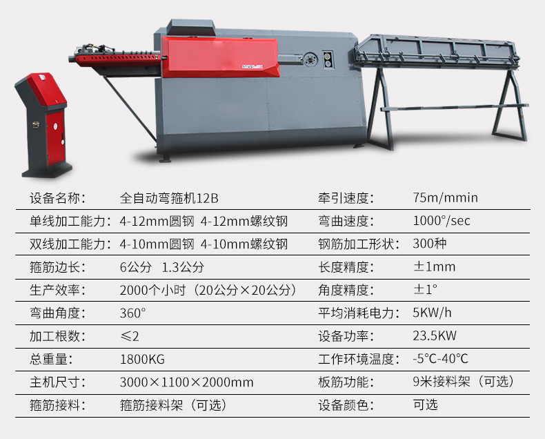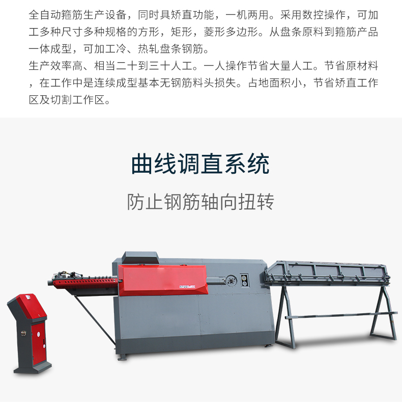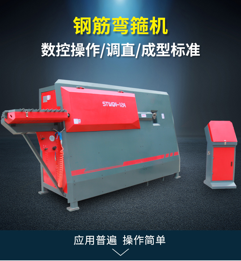 全自动弯箍机可将直径4-10毫米的冷轧带肋钢筋、热轧三级钢、光圆钢筋、有色圆材等进行调直弯箍。全自动弯箍机操作简单、自动化程度高、调节方便、生产效率高,可适用于水泥预制构件厂、水泥制品厂、建筑工地、钢材市场等单位对箍筋的加工、制作。