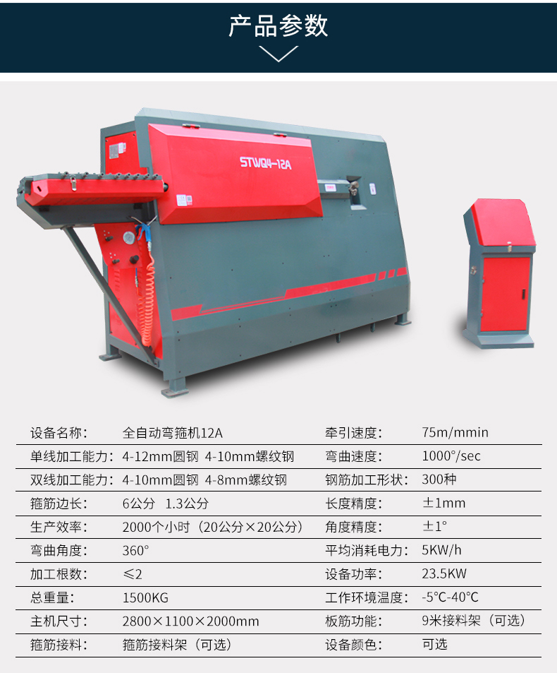 | STWQ4-12 | 1900 | 单线10MM,双线8MM III级螺纹钢 | 牵引9KW-4P弯曲3.75KW-4P | 主机,接料机,气泵 | ||||||||