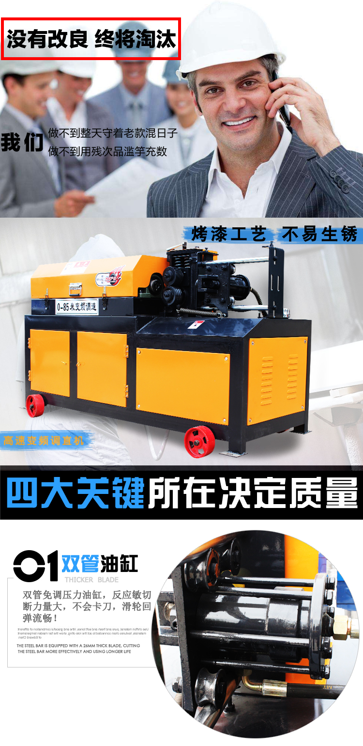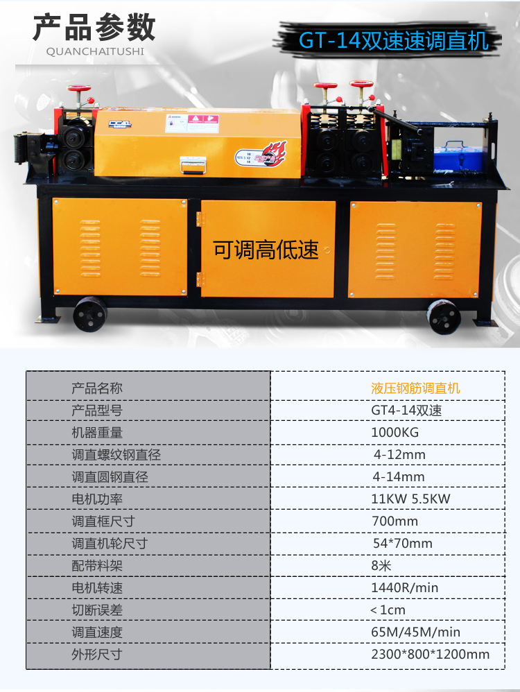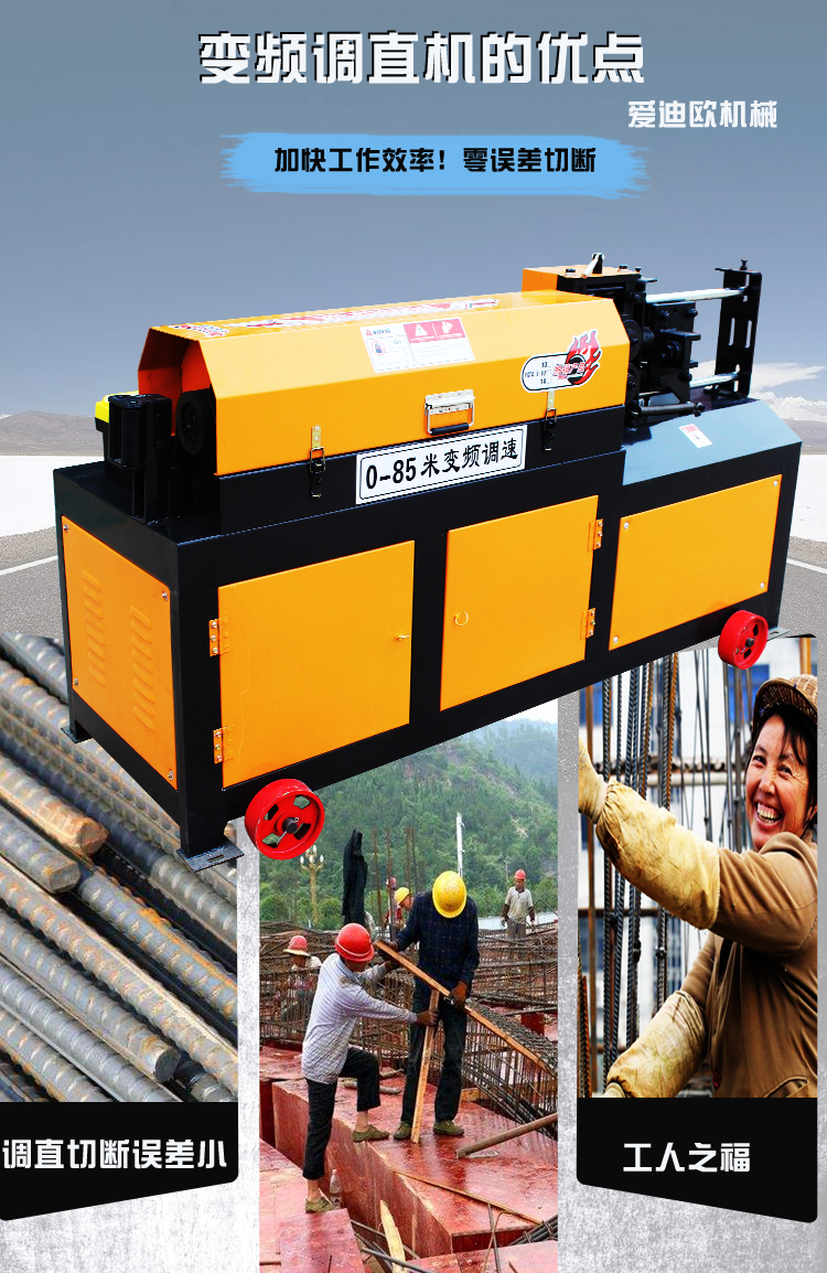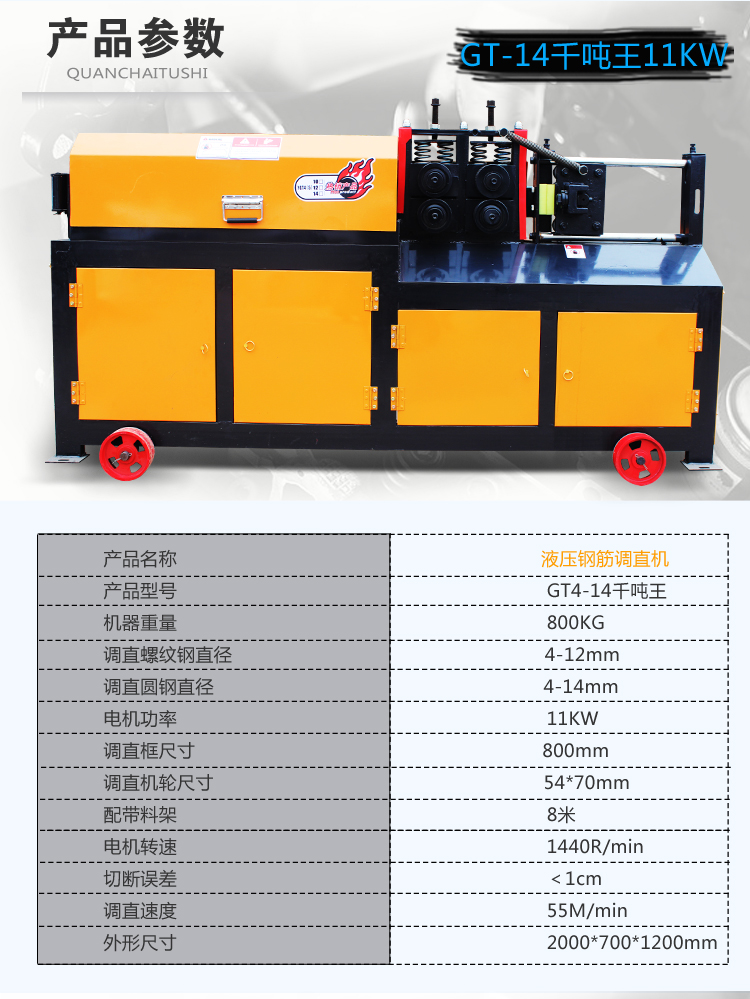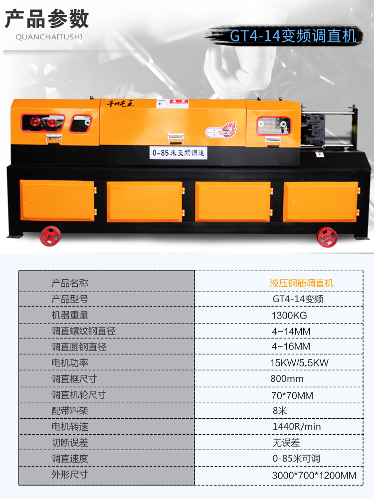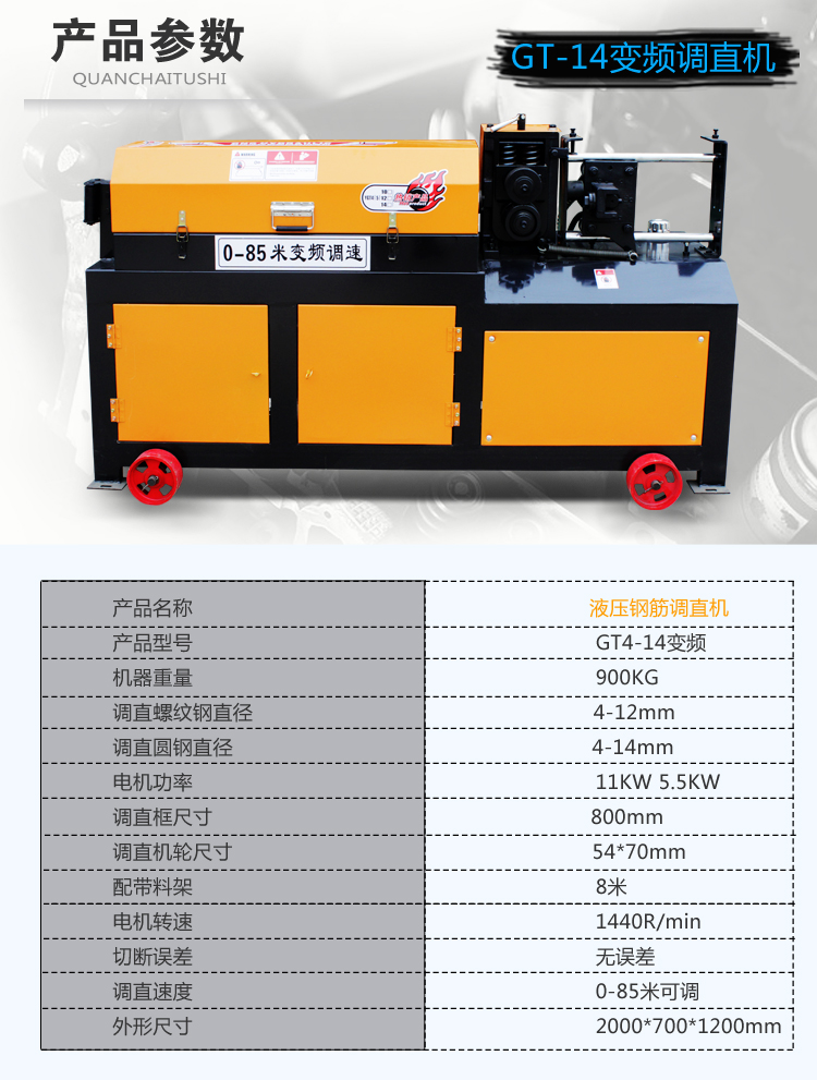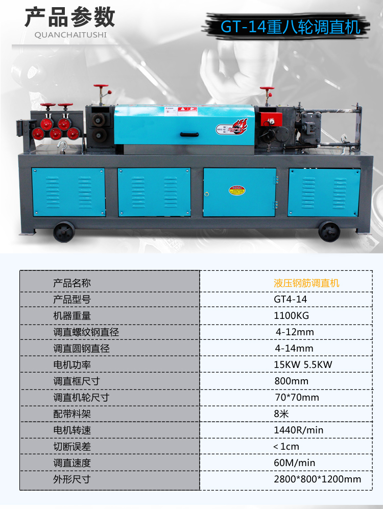 易拆解,搬运安装方便,设有数控装置,可根据客户不同要求、数量、长短定位。调直速度快,切断无误,无噪音,无连切,可调直Φ4-Φ14盘圆钢筋与Φ4-Φ12II级螺纹钢筋,适用于各种建筑工地与钢筋加工、