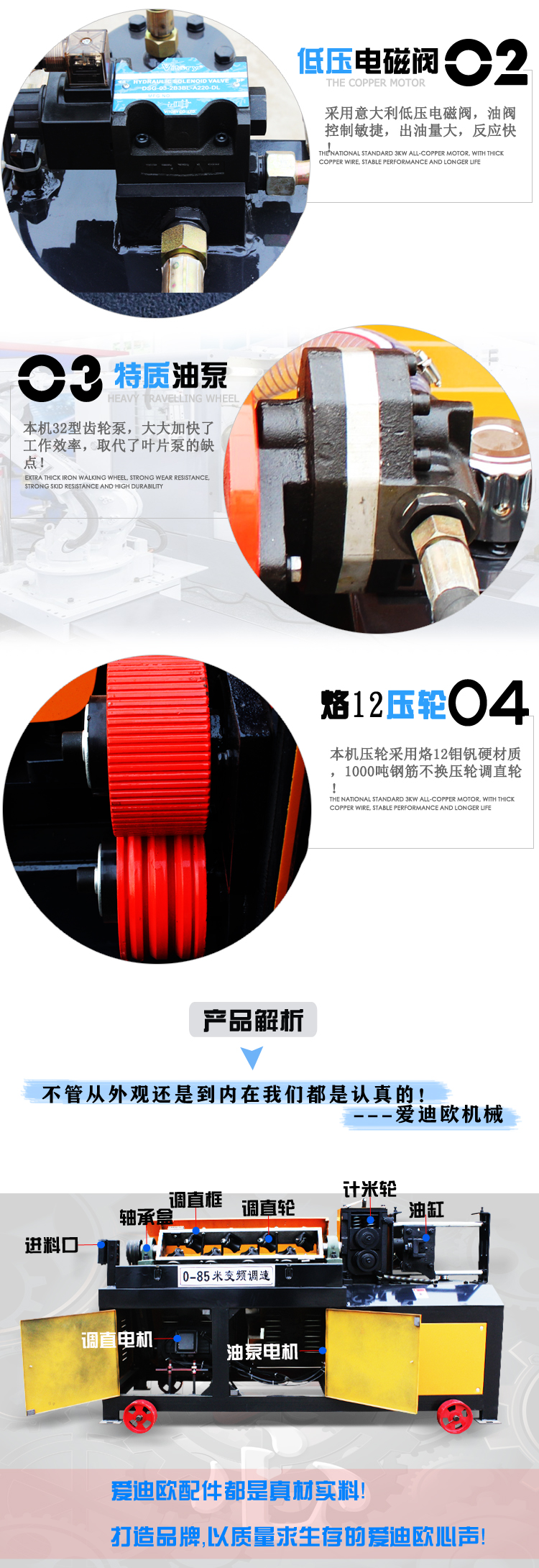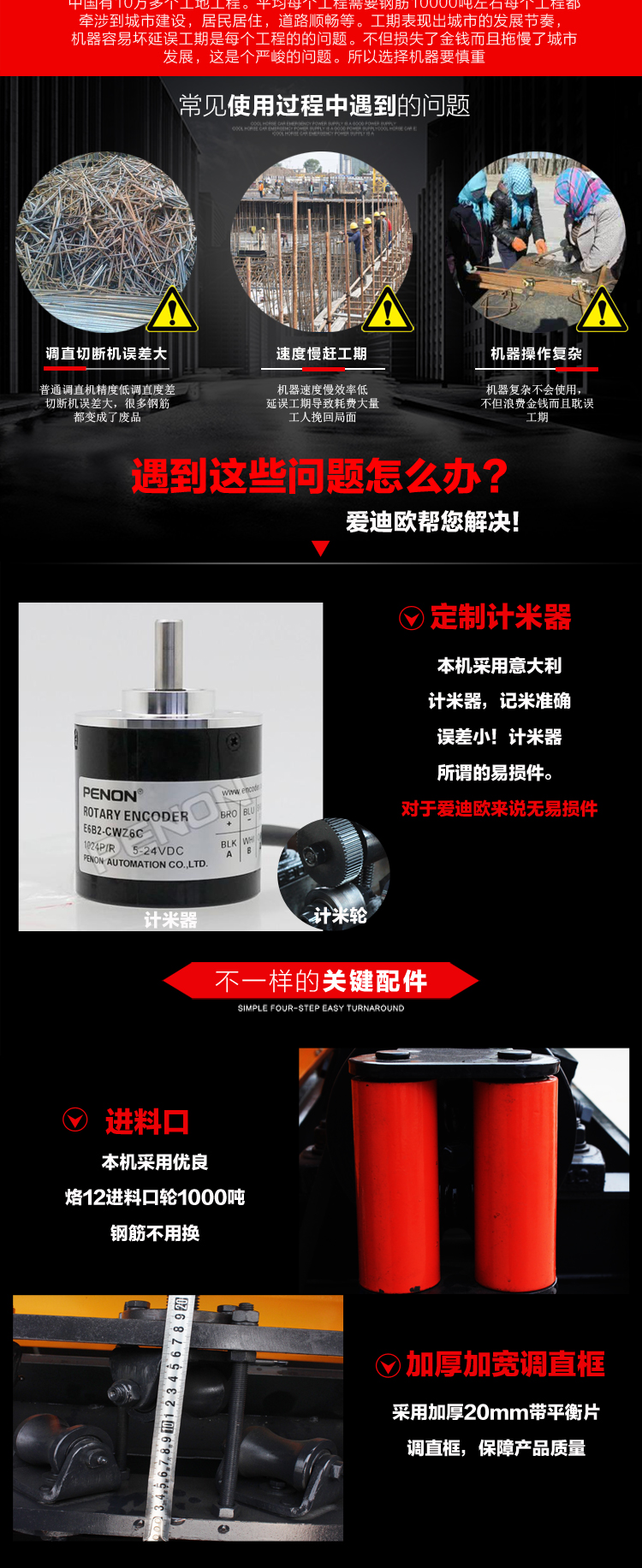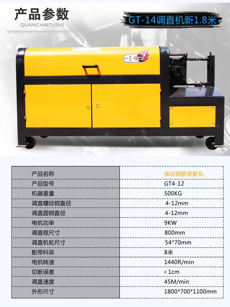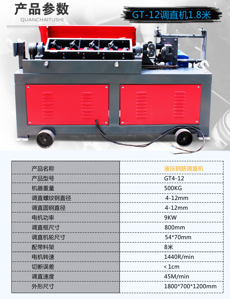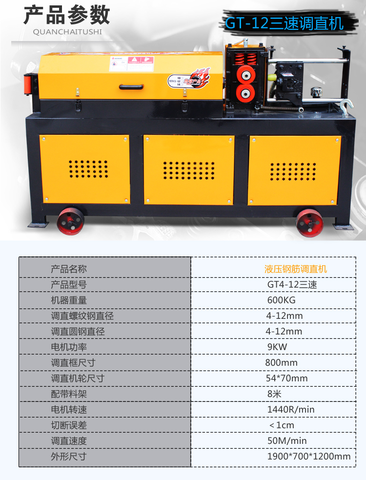 易拆解,搬运安装方便,设有数控装置,可根据客户不同要求、数量、长短定位。调直速度快,切断无误,无噪音,无连切,可调直Φ4-Φ14盘圆钢筋与Φ4-Φ12II级螺纹钢筋,适用于各种建筑工地与钢筋加工、