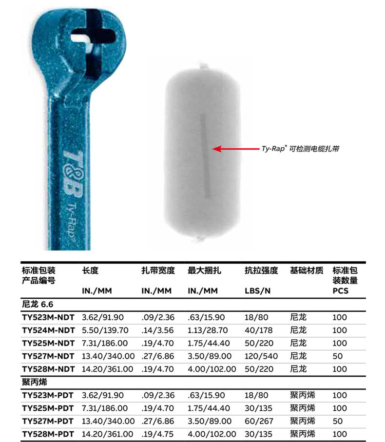 ABB通贝扎带 TY528M-PDT 食品加工可探测聚丙烯尼龙扎带